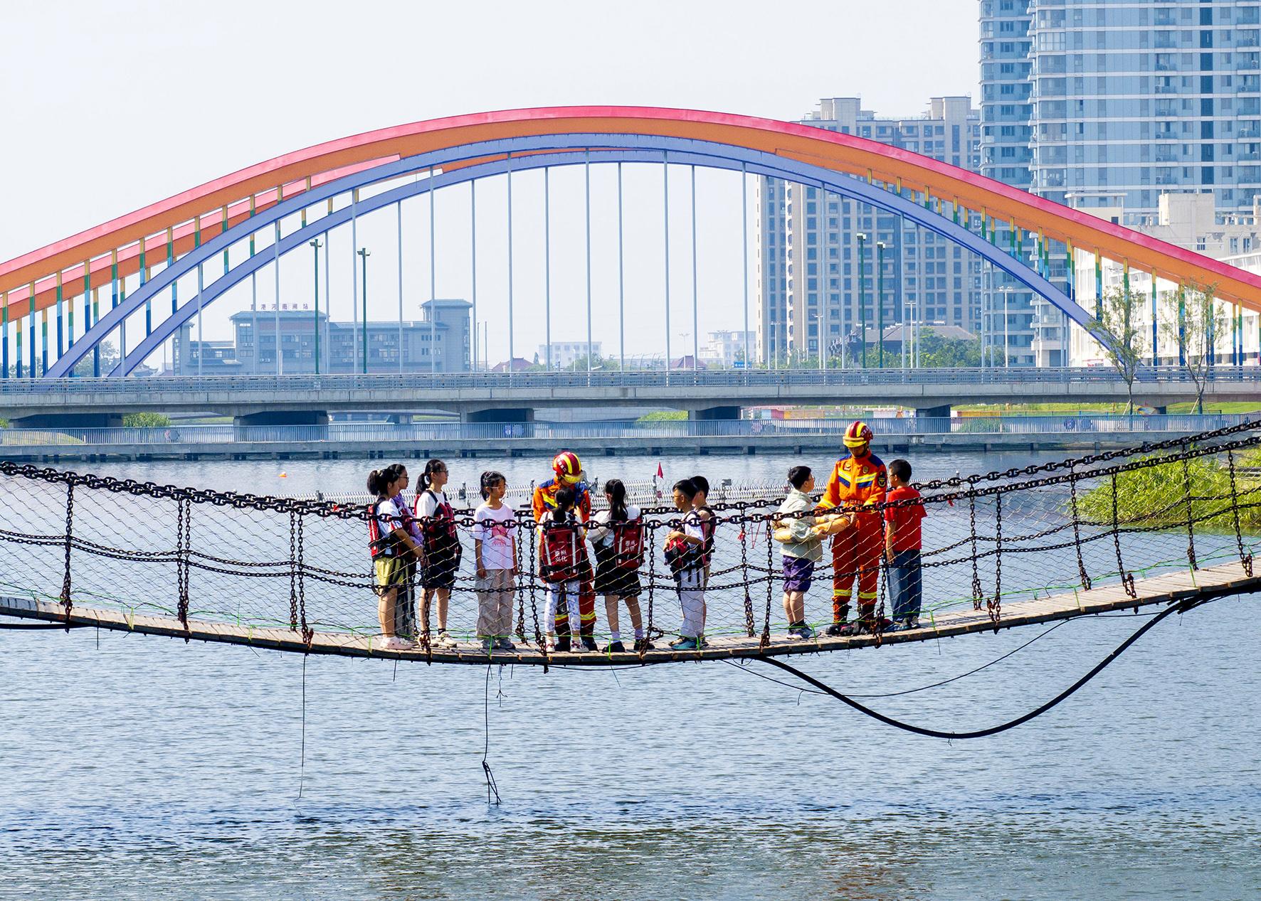 7月2日,在江蘇省興化市昭陽湖公園,興化市消防救援大隊(duì)消防員指導(dǎo)興化市新生中心小學(xué)“日新公益暑托班”學(xué)生學(xué)習(xí)防溺水自救互救的基本知識(shí)與技能。