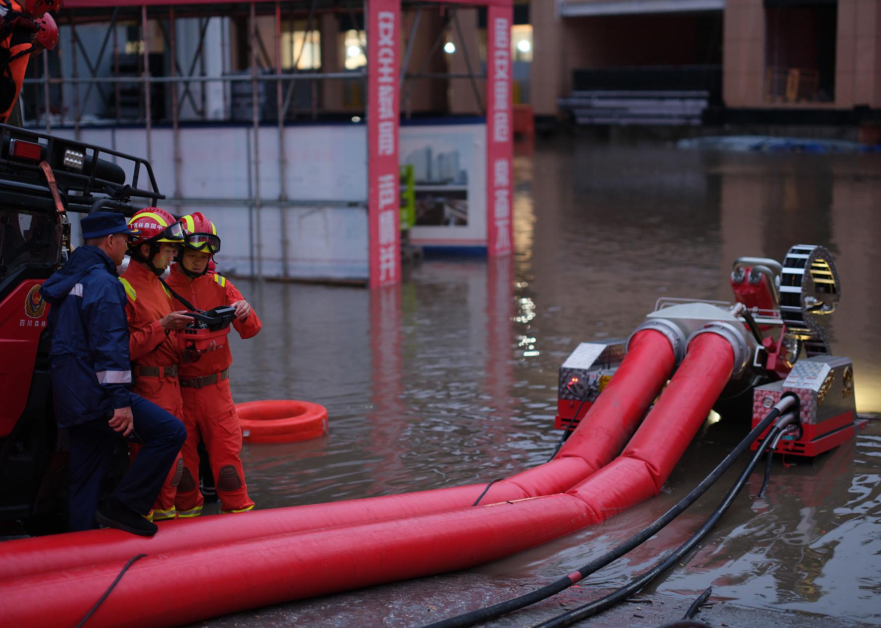 7月3日,成都暴雨致市區(qū)部分區(qū)域出現(xiàn)內澇。四川省森林消防總隊特勤大隊80名消防員攜帶大功率水泵、應急排澇車、排澇機器人等救援裝備,連夜在成都市錦江區(qū)開展排澇救援工作。