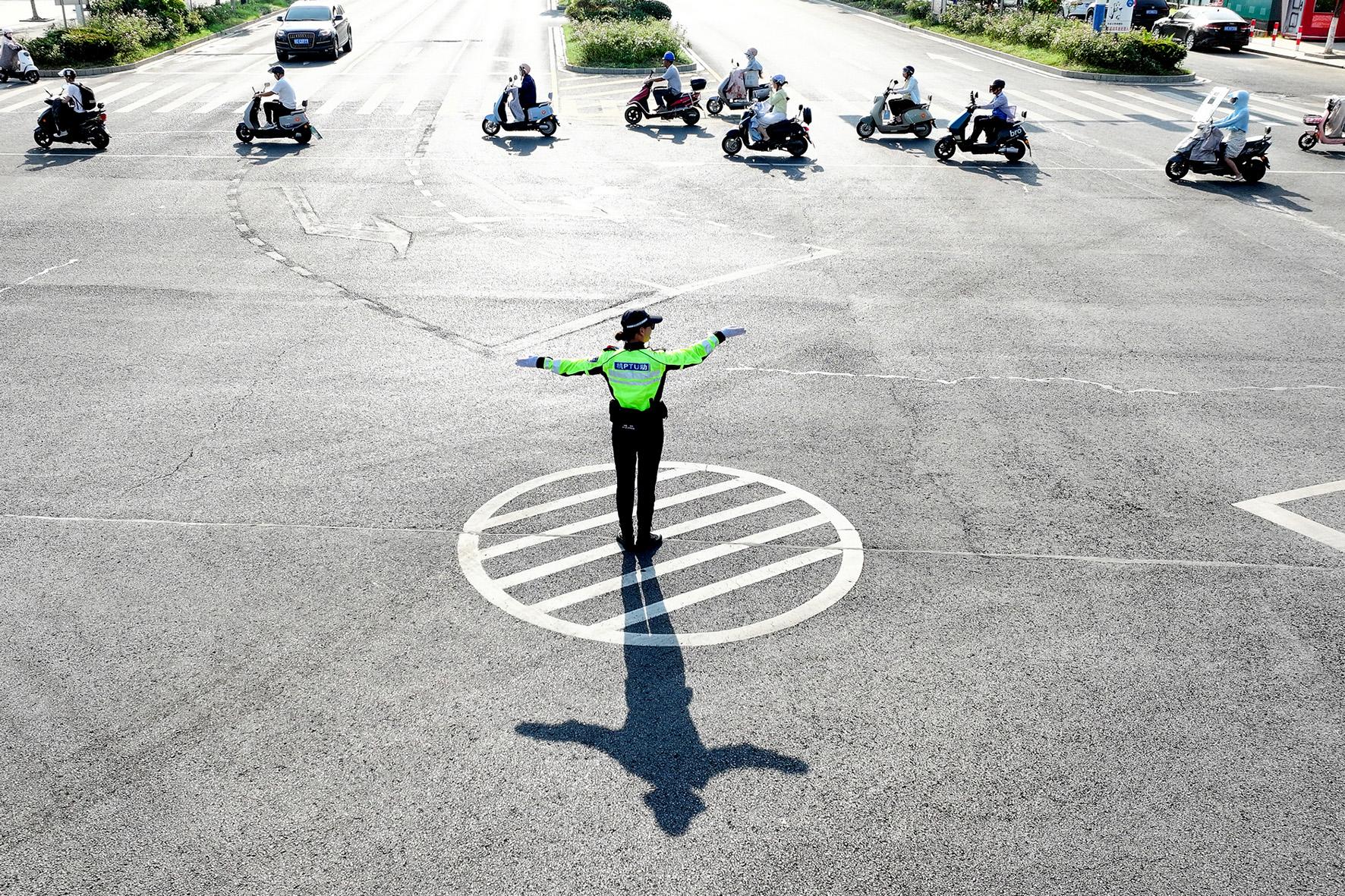 7月7日,安徽省馬鞍山市和縣公安局交警大隊民警在烈日下指揮疏導(dǎo)交通。