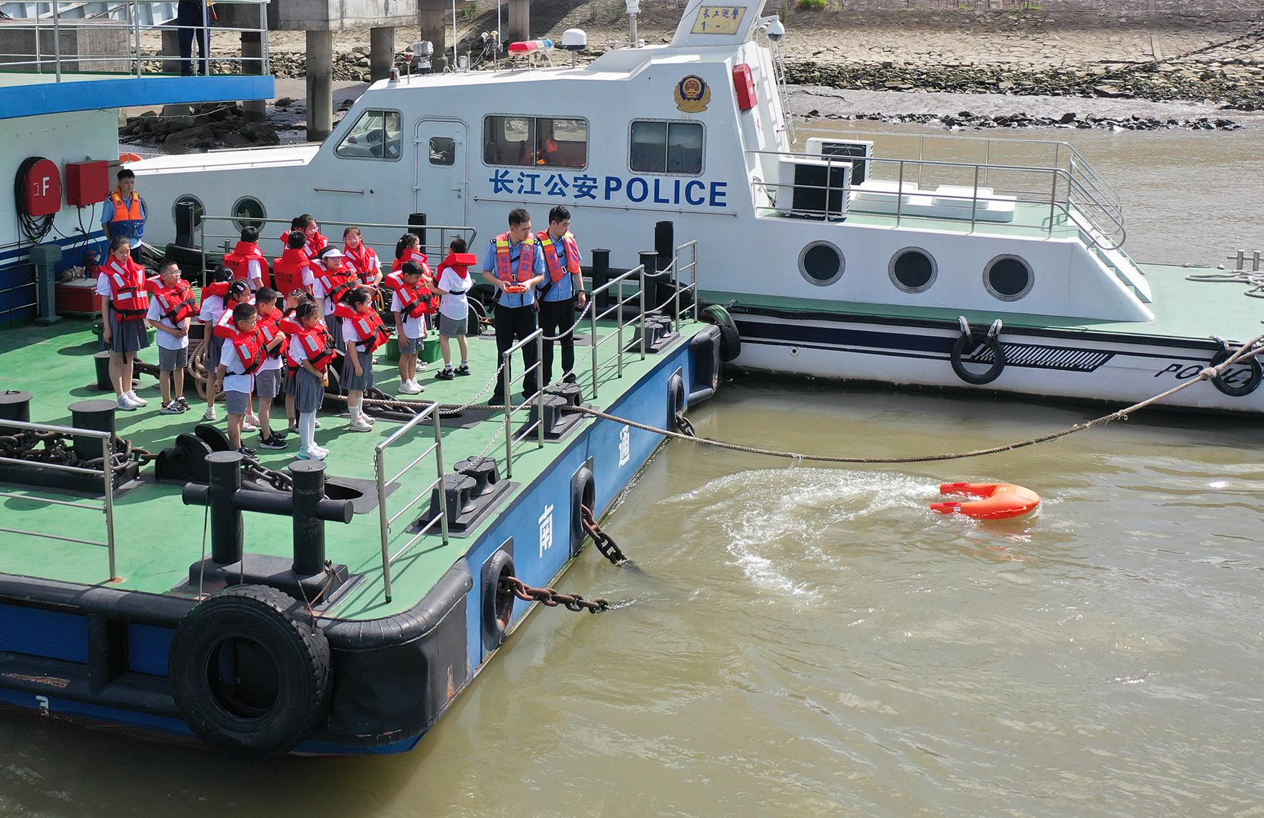 7月23日,長江航運(yùn)公安局南通分局通州派出所民警在水上執(zhí)法基地為愛心暑托班的孩子們宣講防溺水安全知識(shí)。