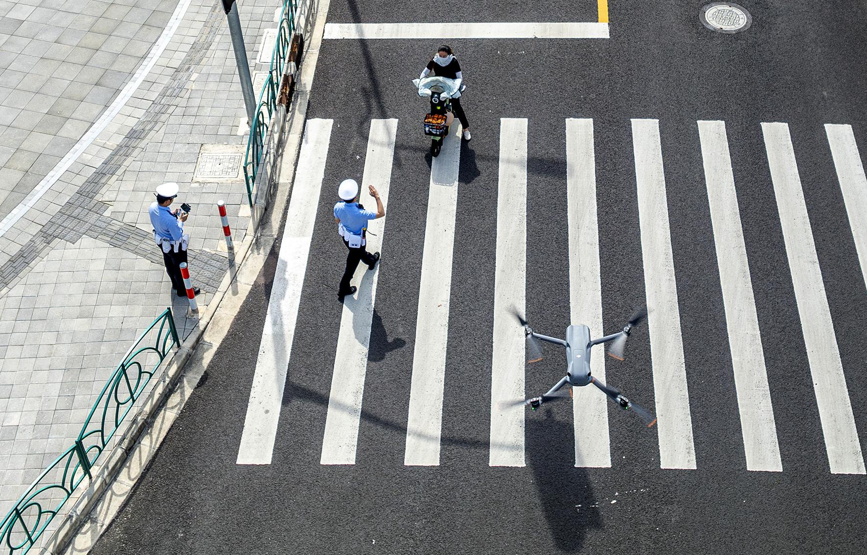 圖為7月22日,民輔警利用無人機查處一起非機動車交通違法行為。