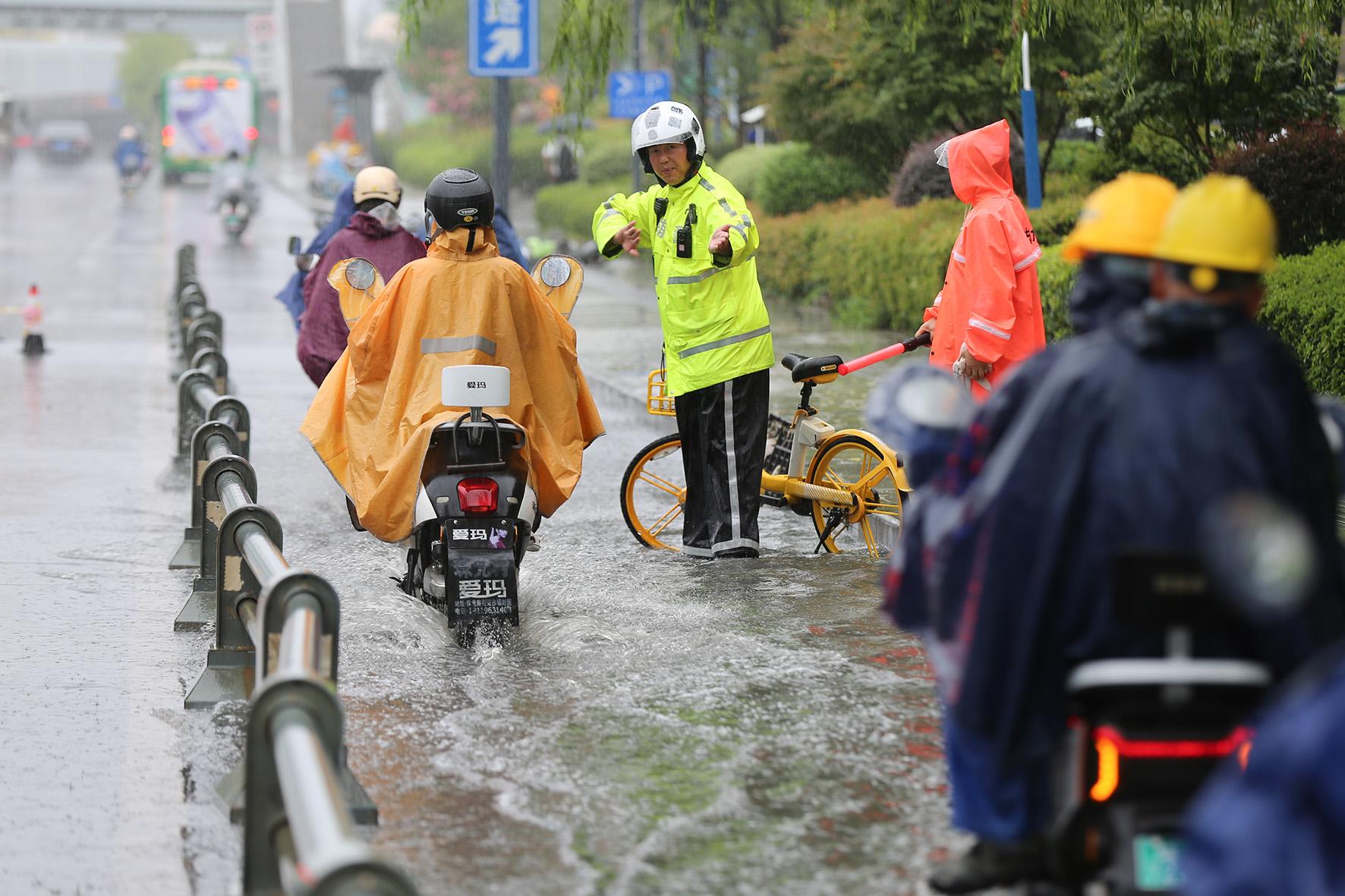 8月11日,受新一輪強(qiáng)降雨影響,安徽省合肥市轄區(qū)部分道路出現(xiàn)積水情況。合肥市公安局交警支隊(duì)民警及時(shí)疏導(dǎo)管控,提醒過往車輛注意減速、安全通行。