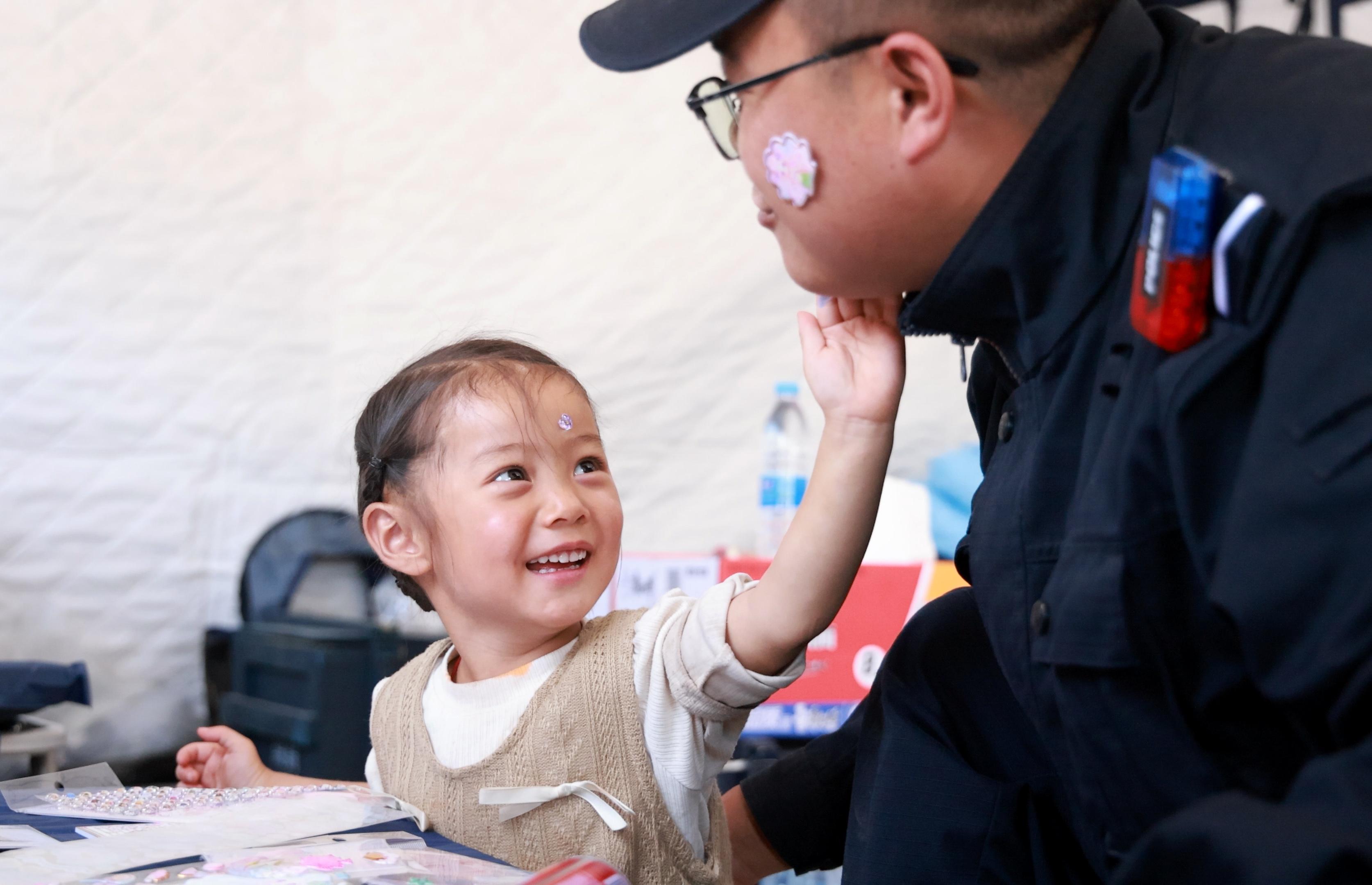 8月14日,瑤瑤在帳篷里給輔警張?jiān)品迥樕腺N貼紙。金萬(wàn)貴 攝