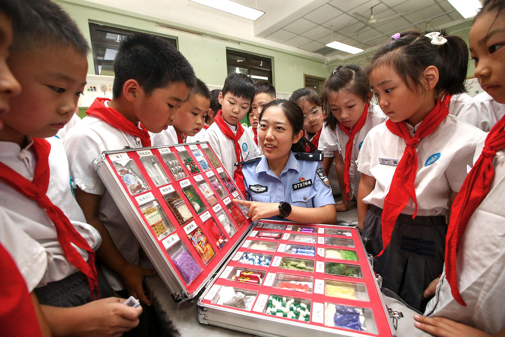 9月1日,山東省濟南市公安局市中分局民警來到愛都小學(xué)利用仿真毒品模型給學(xué)生講解禁毒常識。