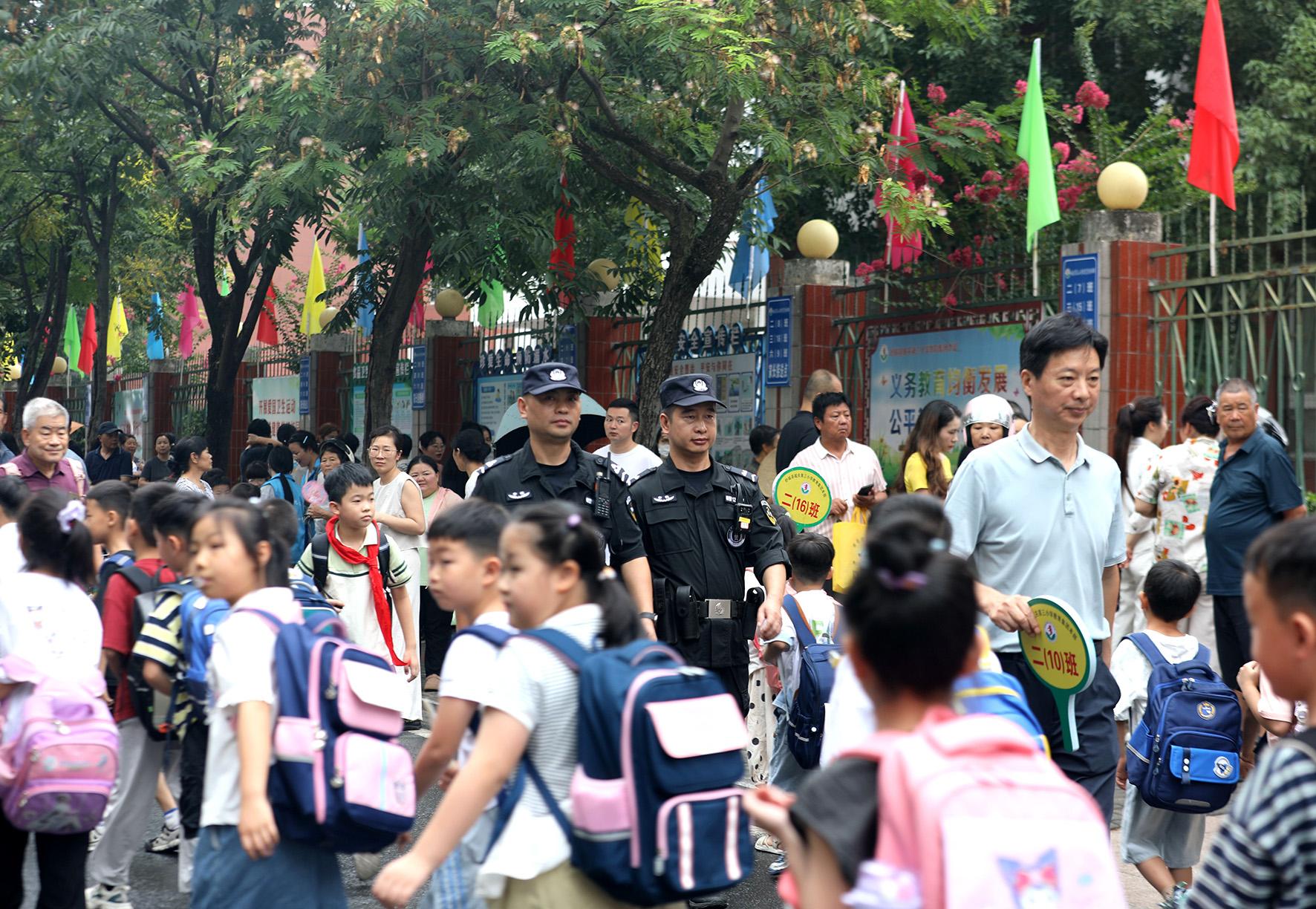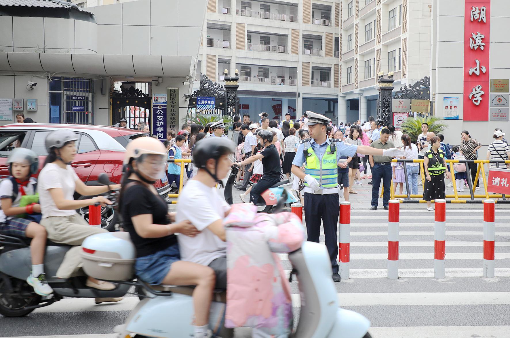 9月1日,江西省九江市公安局交管支隊潯陽大隊民輔警在轄區(qū)學(xué)校門口維護秩序。