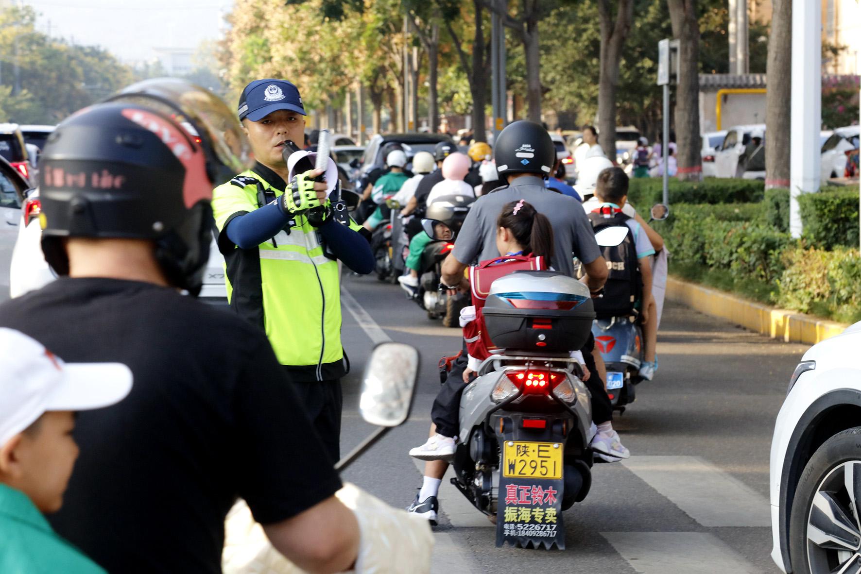 9月1日,陜西省渭南市公安局交警支隊臨渭大隊民警在渭南市實驗小學(xué)十字路口指揮疏導(dǎo)車輛。