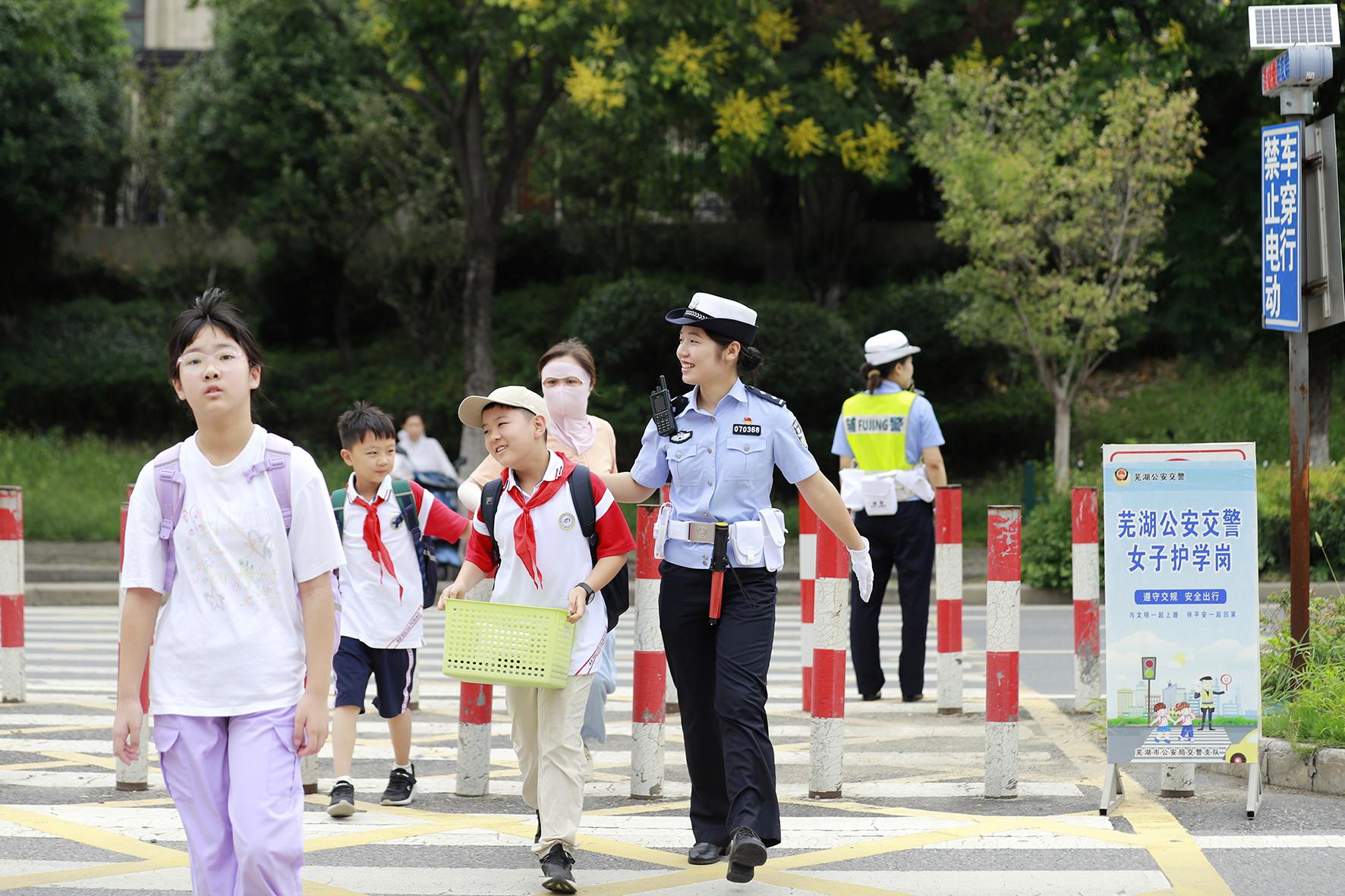 9月1日,安徽省蕪湖市公安局交警支隊弋江大隊女子護學(xué)崗民警,在安徽師范大學(xué)附屬小學(xué)(西校區(qū))護送小學(xué)生平安上學(xué)。