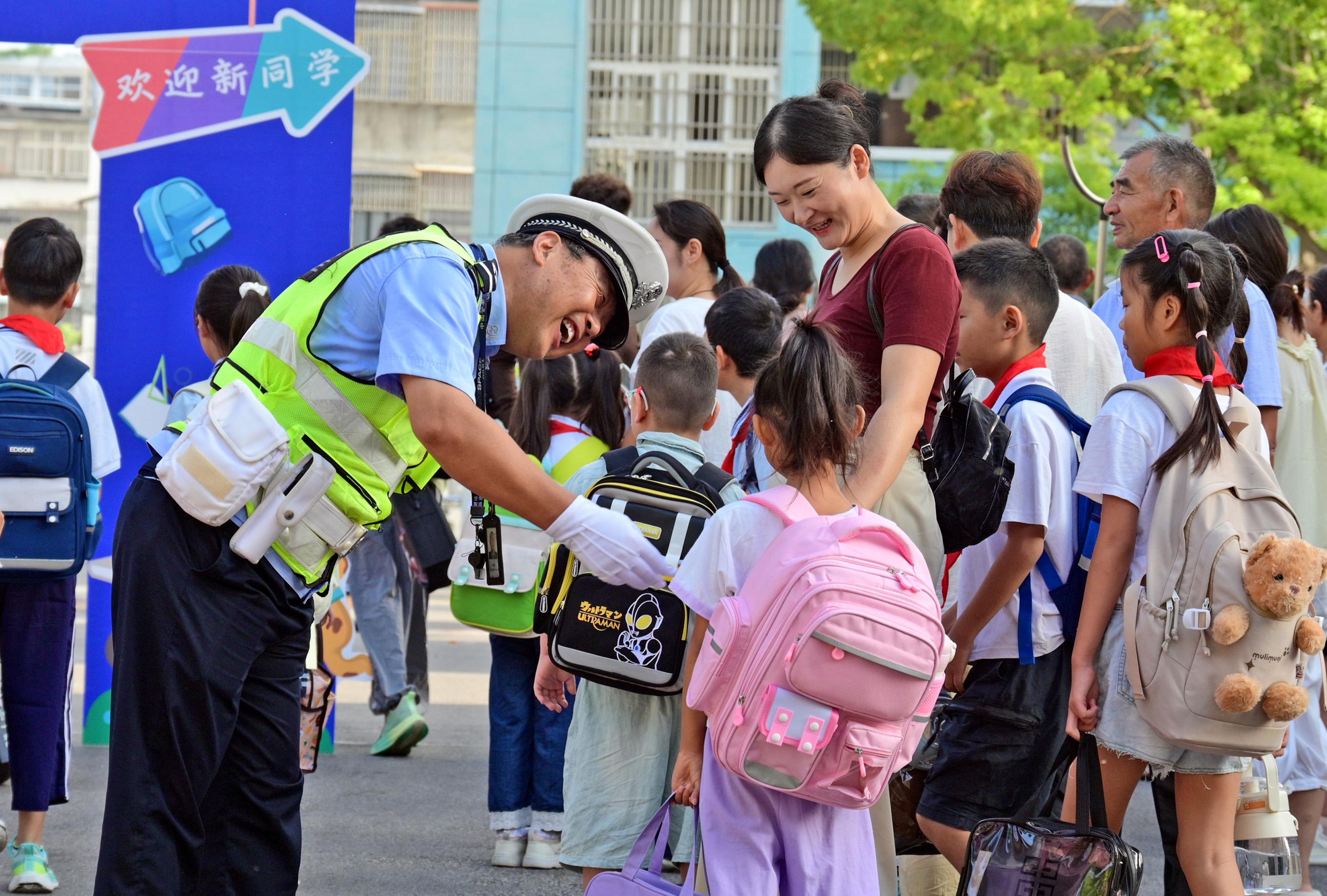 9月1日,安徽省固鎮(zhèn)縣公安局交管大隊輔警在第五小學(xué)護送學(xué)生安全入校。