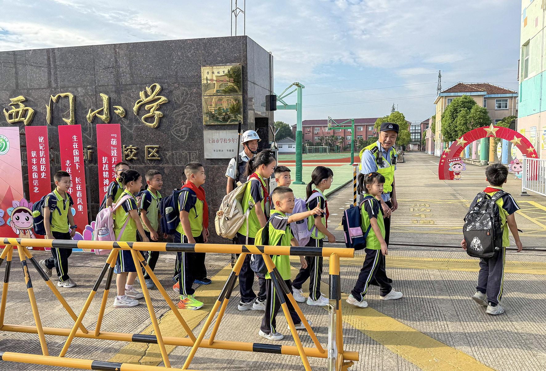 9月1日開學(xué)首日,上海市公安局崇明分局新村派出所民警開展護校安園工作。