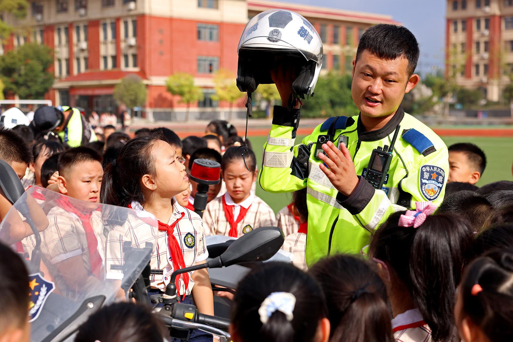 9月1日,山東省棗莊市公安局市中分局交通管理大隊鐵騎隊員在東湖小學(xué)向?qū)W生們普及交通安全知識。
