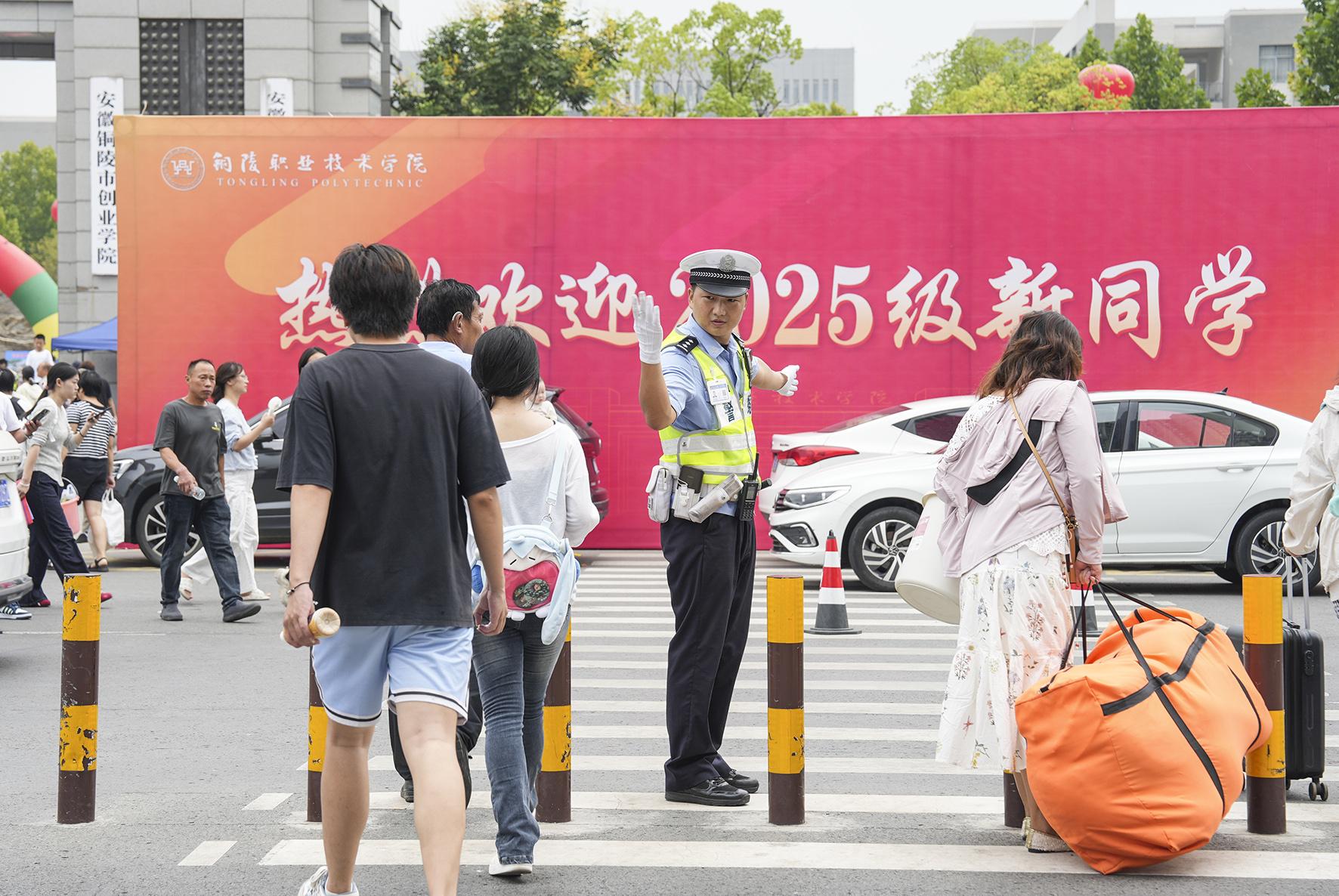 9月7日,安徽省銅陵職業(yè)技術(shù)學院迎來2025級新生報到高峰。銅陵市公安局交警支隊科學部署警力疏導交通秩序,有效緩解校園周邊交通壓力。