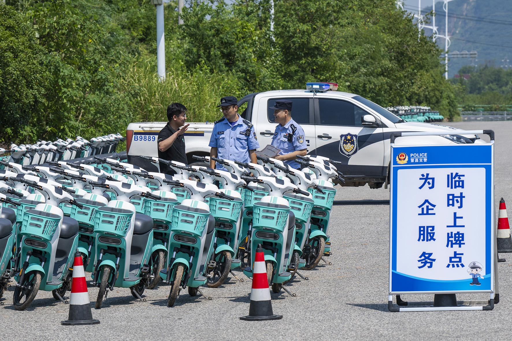 9月5日,安徽省蕪湖市公安局繁昌分局交通管理大隊車輛管理所民警在繁陽鎮(zhèn)為一家共享電動自行車企業(yè)提供上門上牌服務(wù)。