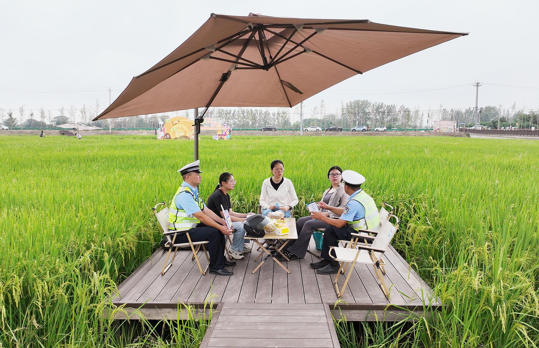 9月23日,安徽省蕪湖市公安局交管支隊(duì)鳩江大隊(duì)民輔警在“慶農(nóng)業(yè)豐收 享美好生活”2025年中國農(nóng)民豐收節(jié)活動(dòng)現(xiàn)場,以拉家常的方式向群眾宣講交通安全知識(shí)。