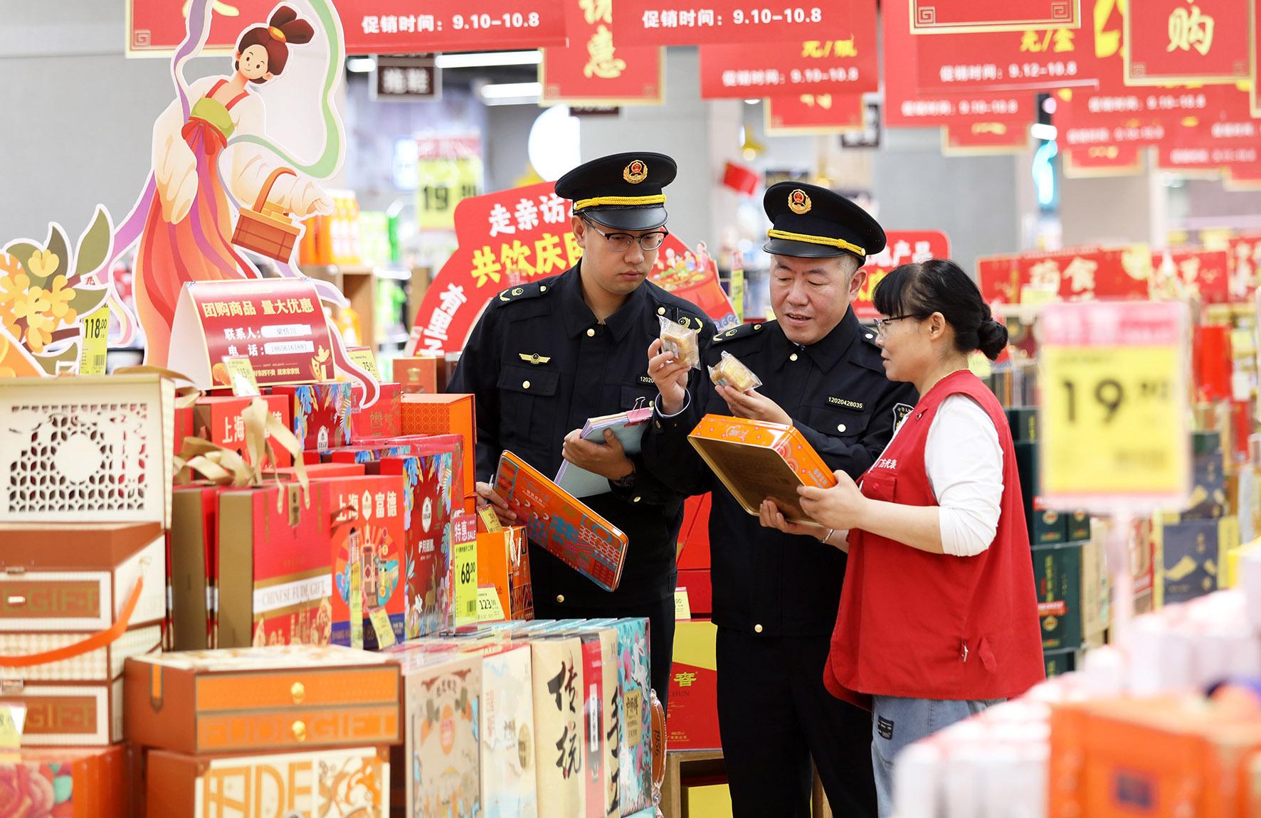9月24日,安徽省淮北市相山區(qū)桓譚市場監(jiān)管所執(zhí)法人員在轄區(qū)進行商品質(zhì)量檢查。國慶、中秋將至,淮北市相山區(qū)市場監(jiān)管部門組織執(zhí)法人員,對節(jié)前市場開展專項檢查。