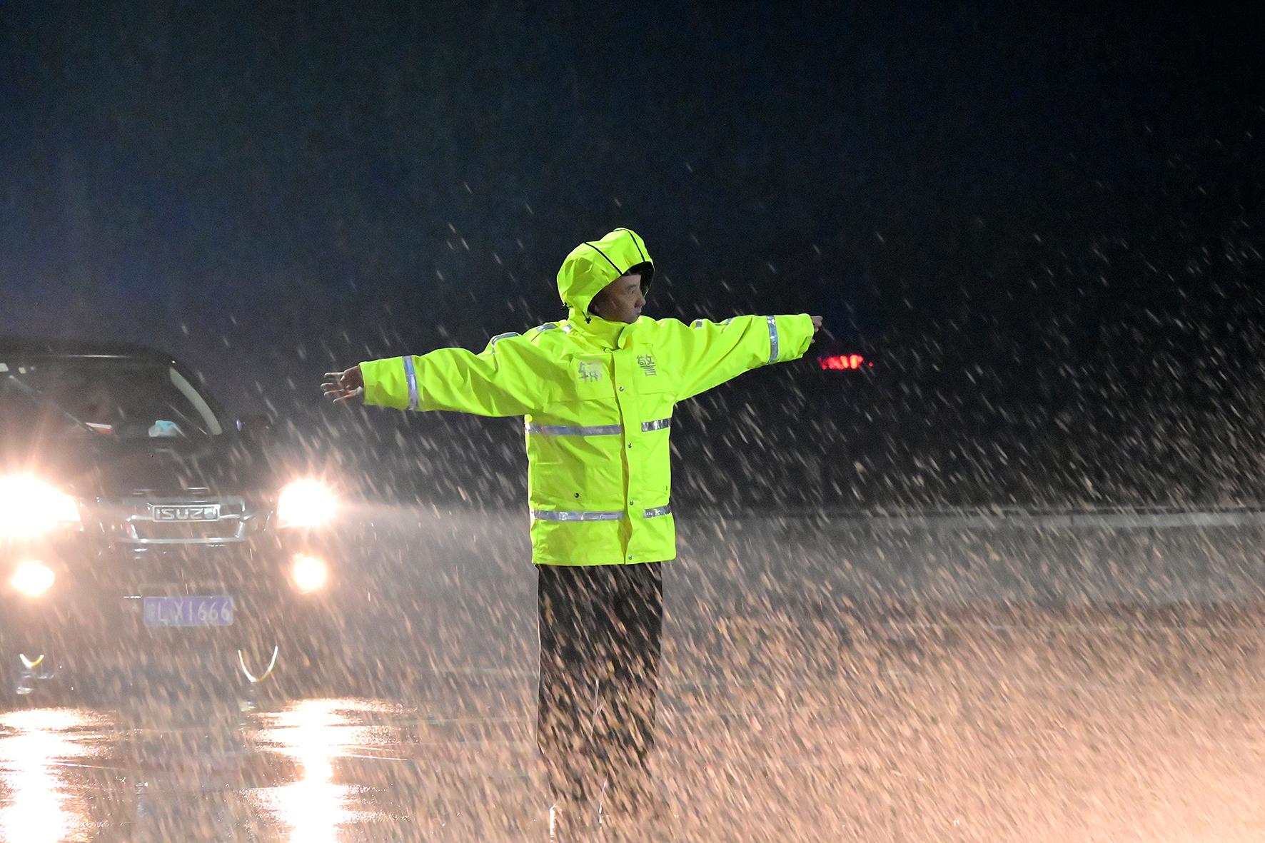 10月25日,安徽省固鎮(zhèn)縣出現(xiàn)降雨天氣。固鎮(zhèn)縣公安局交管大隊民警輔警冒雨堅守路面,加強道路的巡邏管控和指揮疏導,確保交通安全。