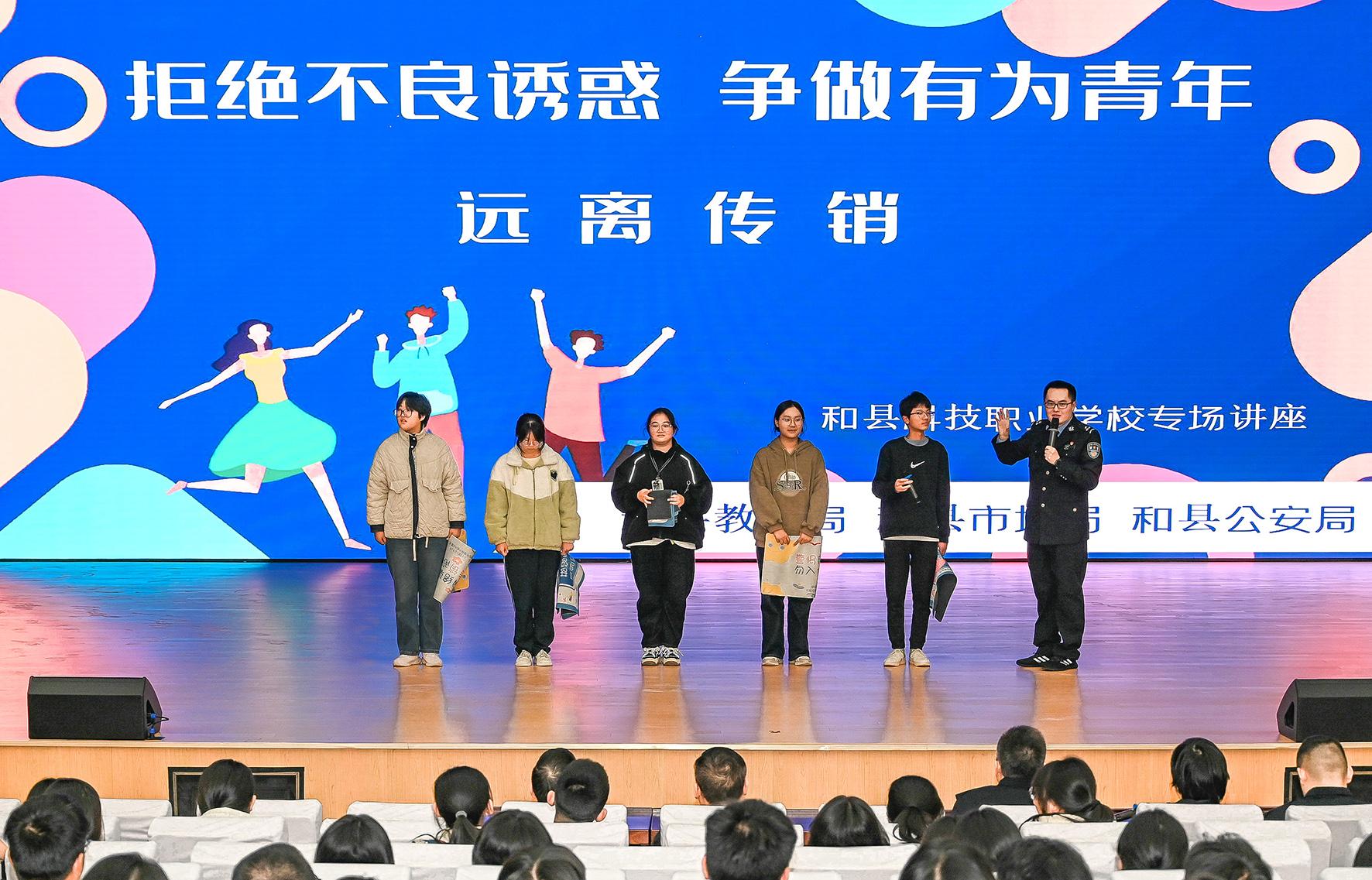 10月27日,安徽省馬鞍山市和縣公安局聯(lián)合市場監(jiān)督管理局走進科技職業(yè)學校,舉辦主題為“拒絕不良誘惑 爭做有為青年”的防范傳銷報告會。