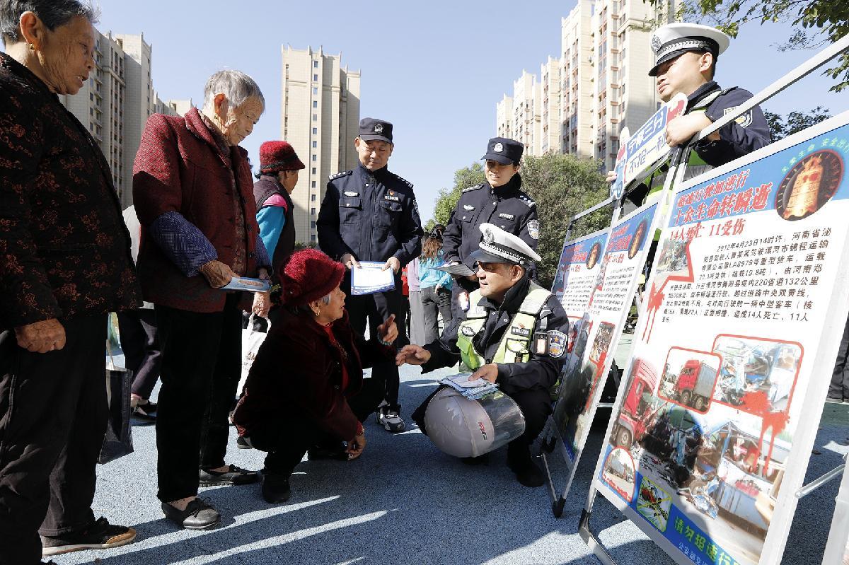 10月29日重陽(yáng)節(jié),安徽省蕪湖市公安局交管支隊(duì)鳩江大隊(duì)民警輔警走進(jìn)二壩鎮(zhèn)盛世華府小區(qū),向老年人群宣傳“一盔一帶”、反詐等安全知識(shí)。