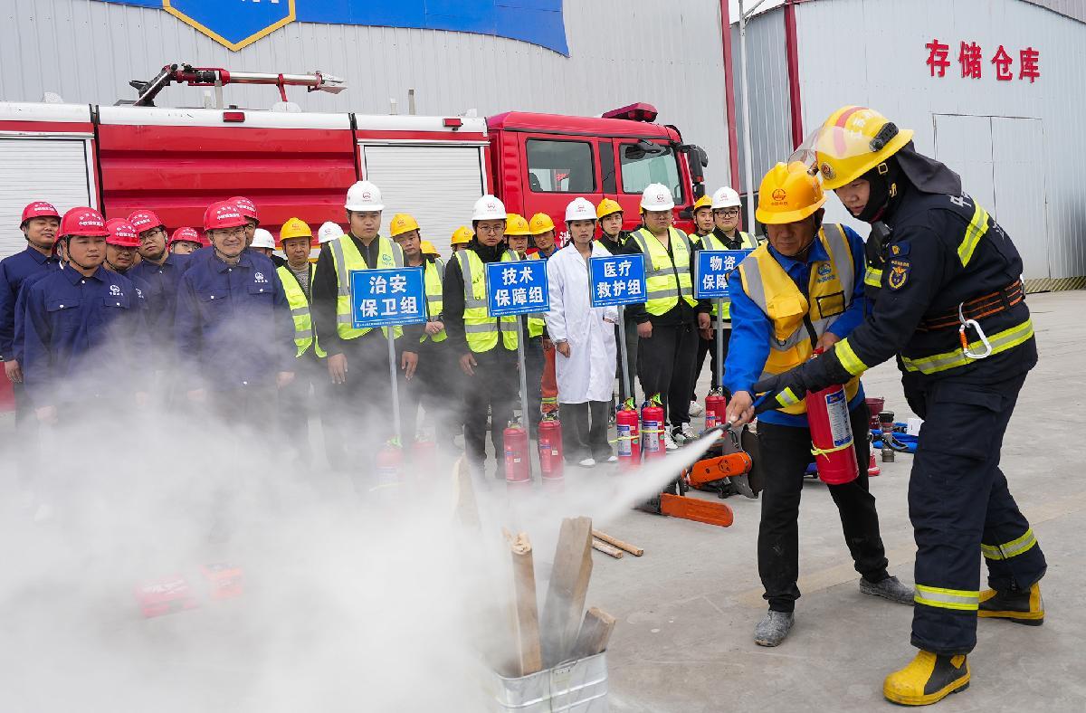 11月7日,江蘇省興化市消防救援大隊消防員指導(dǎo)鹽宜鐵路項目部工人正確使用滅火器。