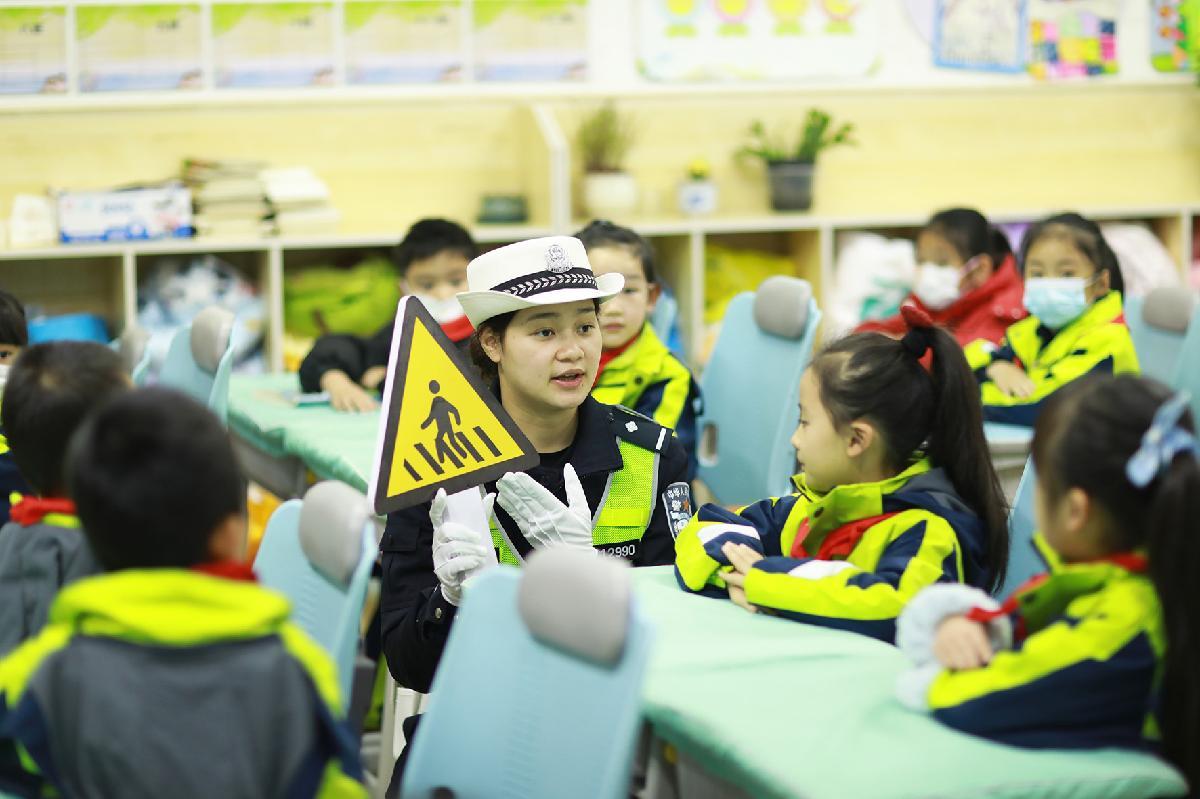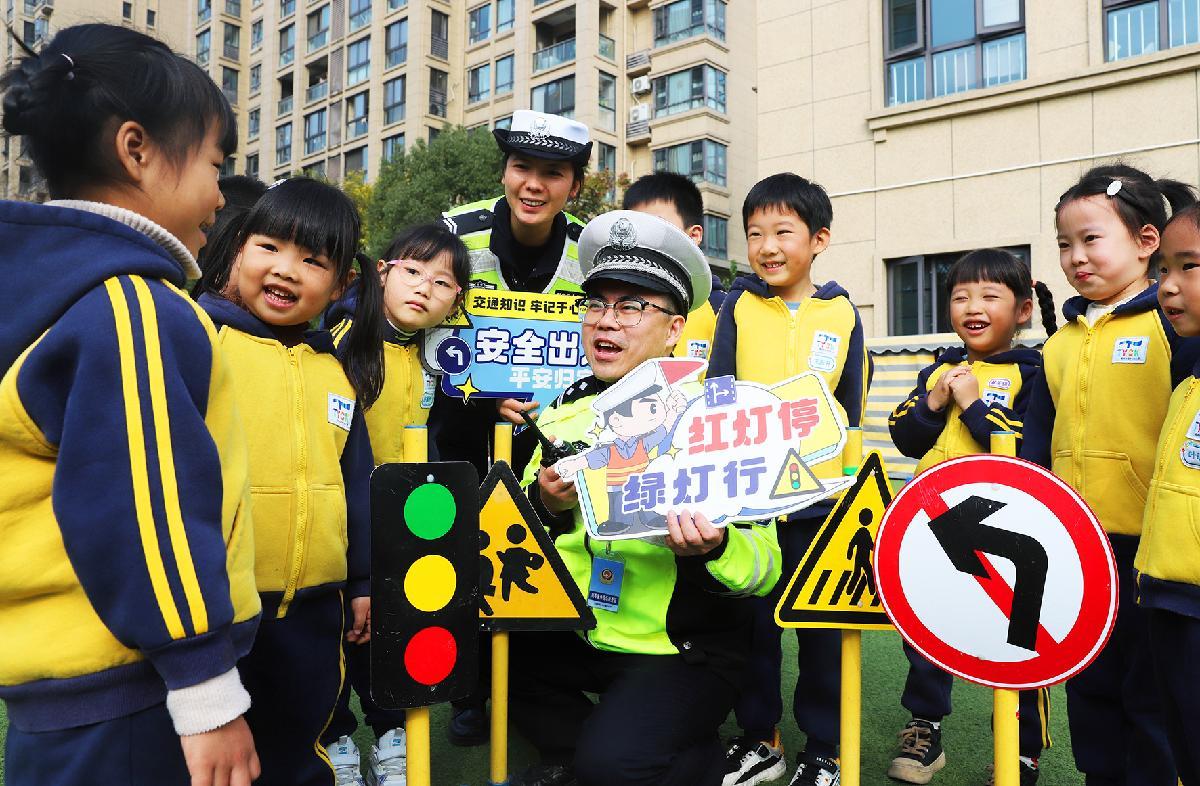 12月2日,浙江省臺州市公安局交通警察局直屬三大隊三中隊民警在桐嶼街道中心幼兒園向小朋友們普及交通安全知識。