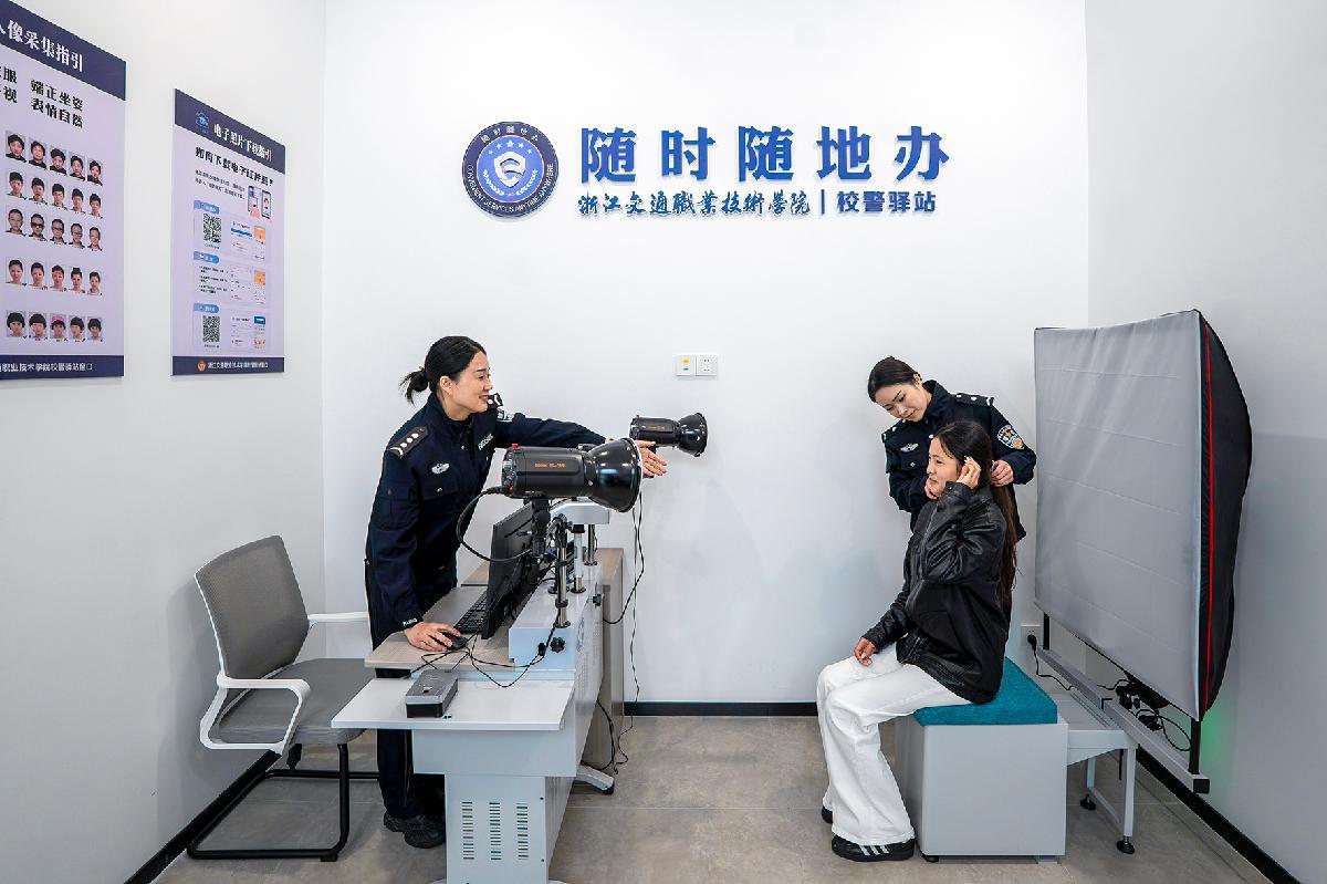 12月9日,浙江省長興縣公安局林城派出所駐浙江交通職業(yè)技術(shù)學(xué)院(長興校區(qū))“校警驛站”工作人員為學(xué)生補辦身份證件。