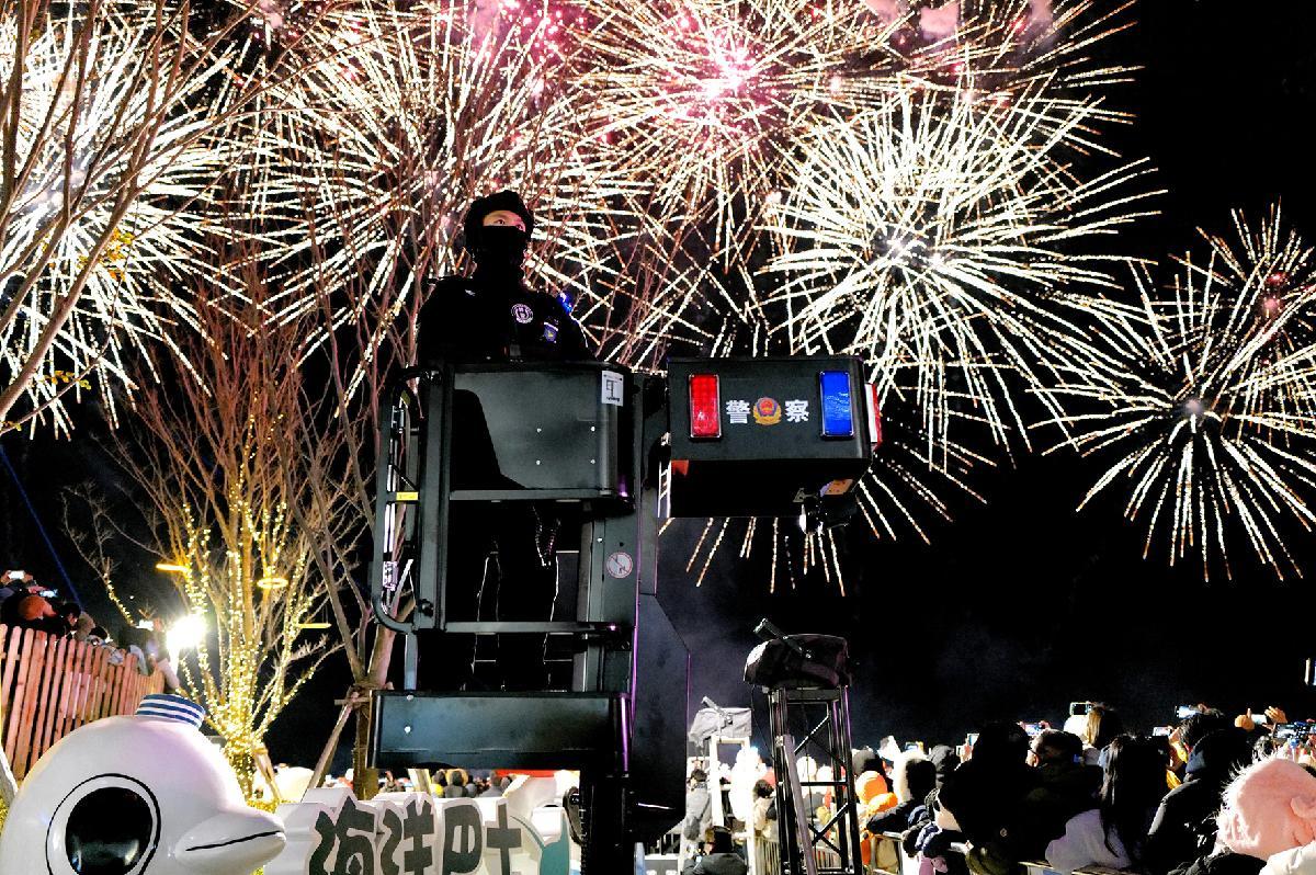 2025年12月31日晚,上海市公安局寶山分局民警在跨年迎新活動(dòng)現(xiàn)場(chǎng)警用多功能升降瞭望臺(tái)上執(zhí)勤。