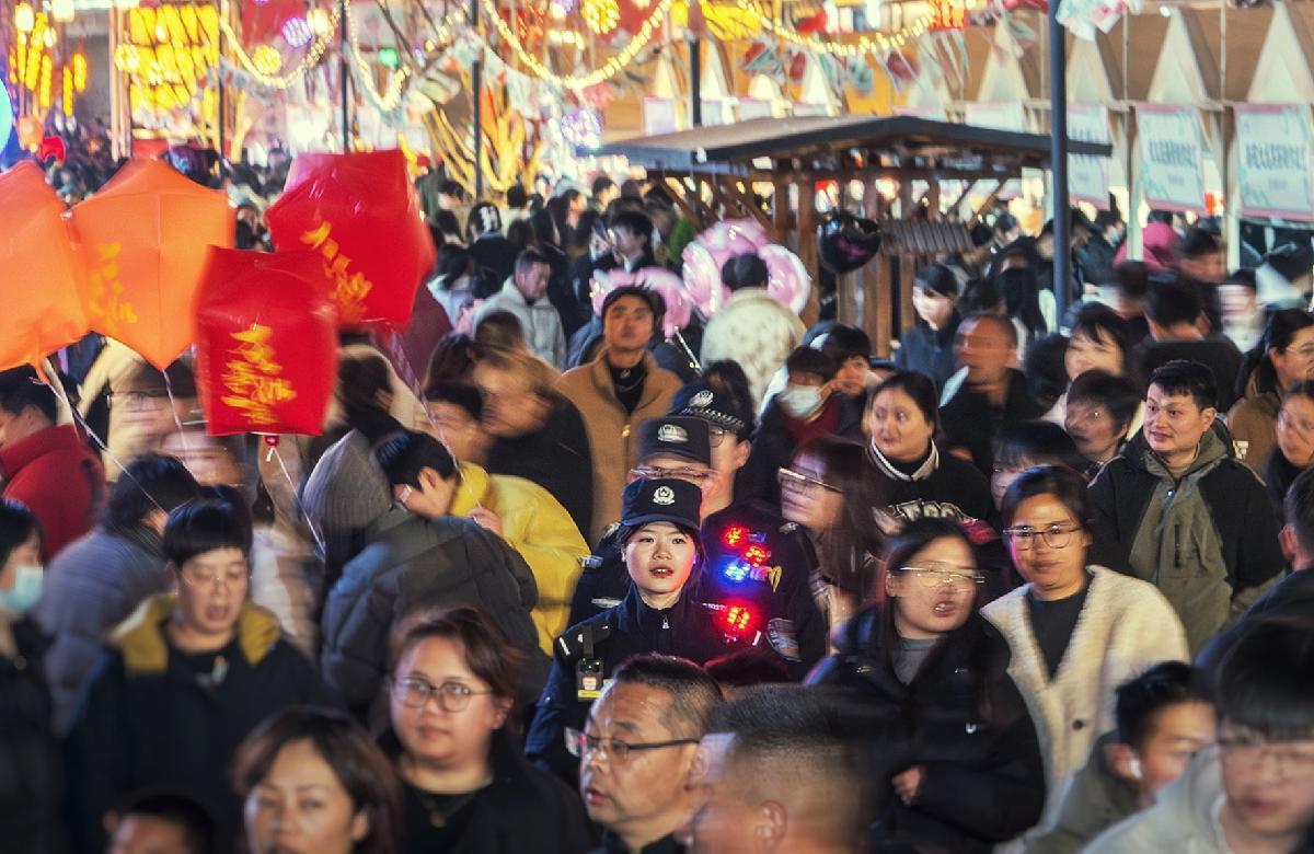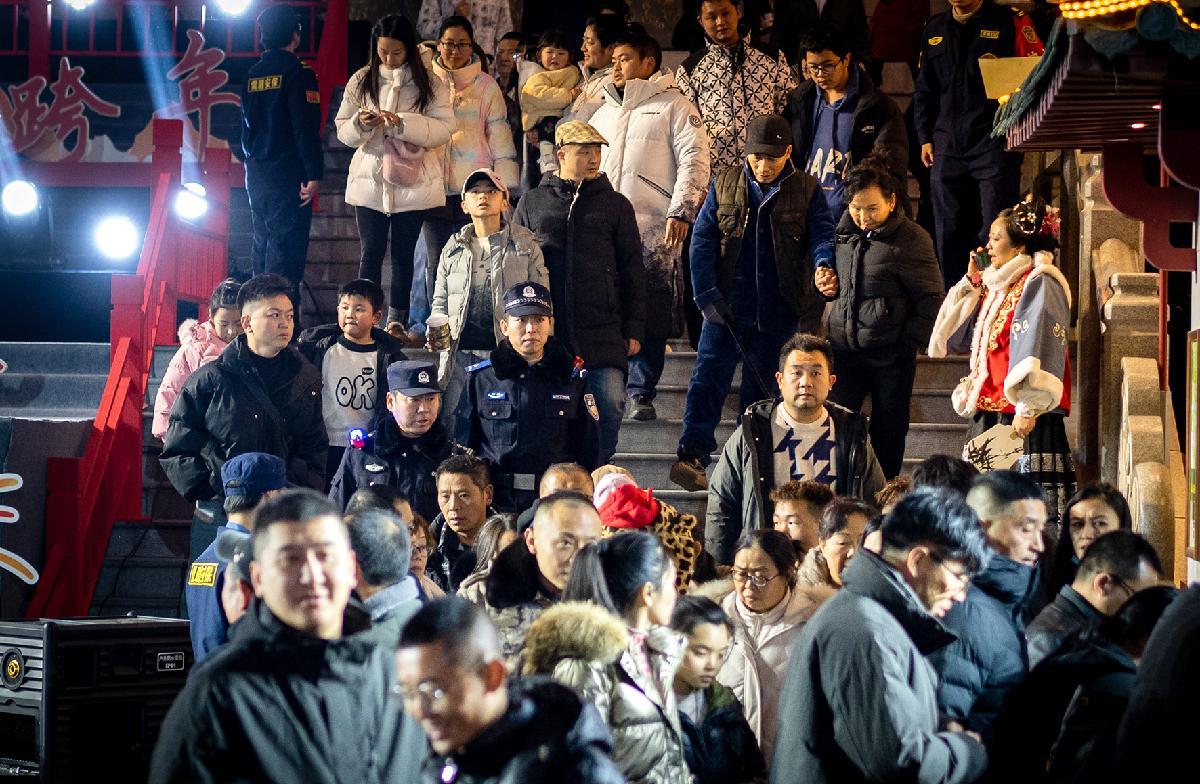 2025年12月31日,四川省綿陽(yáng)市公安局游仙分局民輔警在游仙區(qū)越王樓風(fēng)景區(qū)跨年活動(dòng)現(xiàn)場(chǎng)巡邏。