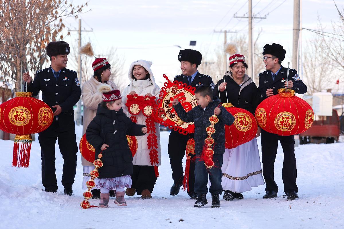 2025年12月31日,新疆阿勒泰邊境管理支隊(duì)恰爾夏特邊境檢查站民警與轄區(qū)牧民群眾一起話平安、掛燈籠、迎新年。
