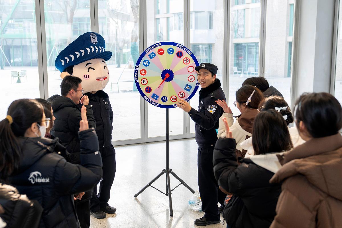 圖為民警與學(xué)生們開展交通安全知識有獎問答。
