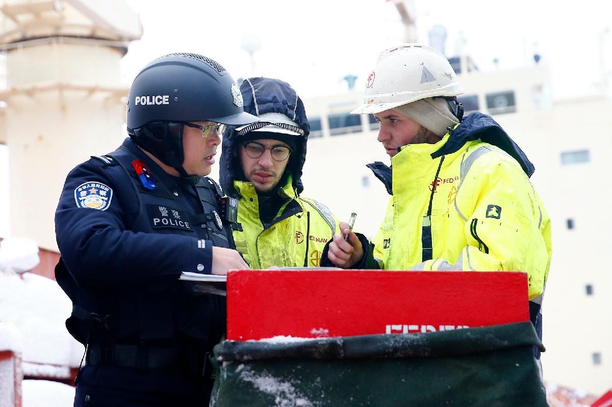 1月20日,南京港邊檢站執(zhí)勤民警登上??吭谛律赘蹍^(qū)401泊位的馬紹爾群島籍“高克斯”輪,向外籍船員進(jìn)行冰雪天氣安全作業(yè)提醒。