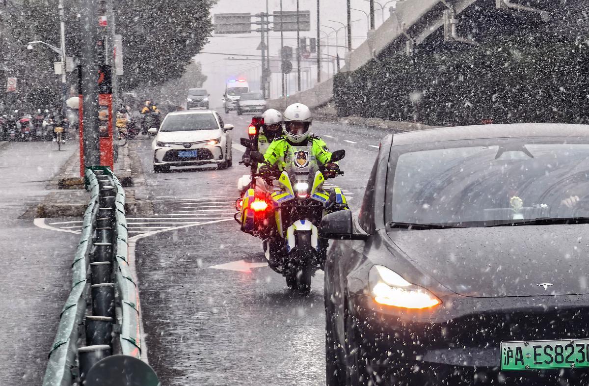 1月20日清晨,申城迎來雨雪天氣。上海市公安局閔行分局交管支隊(duì)顯性派警,在重點(diǎn)區(qū)域疏導(dǎo)交通,為民紓困。