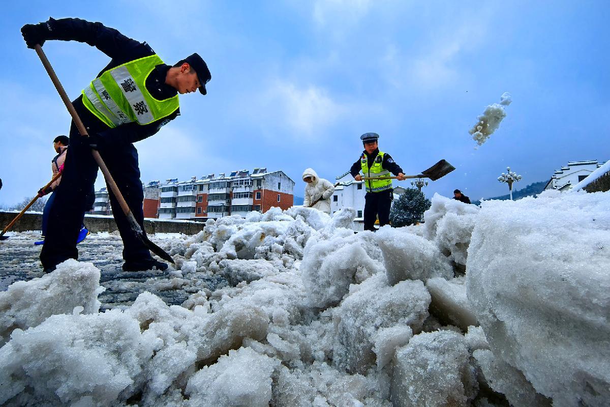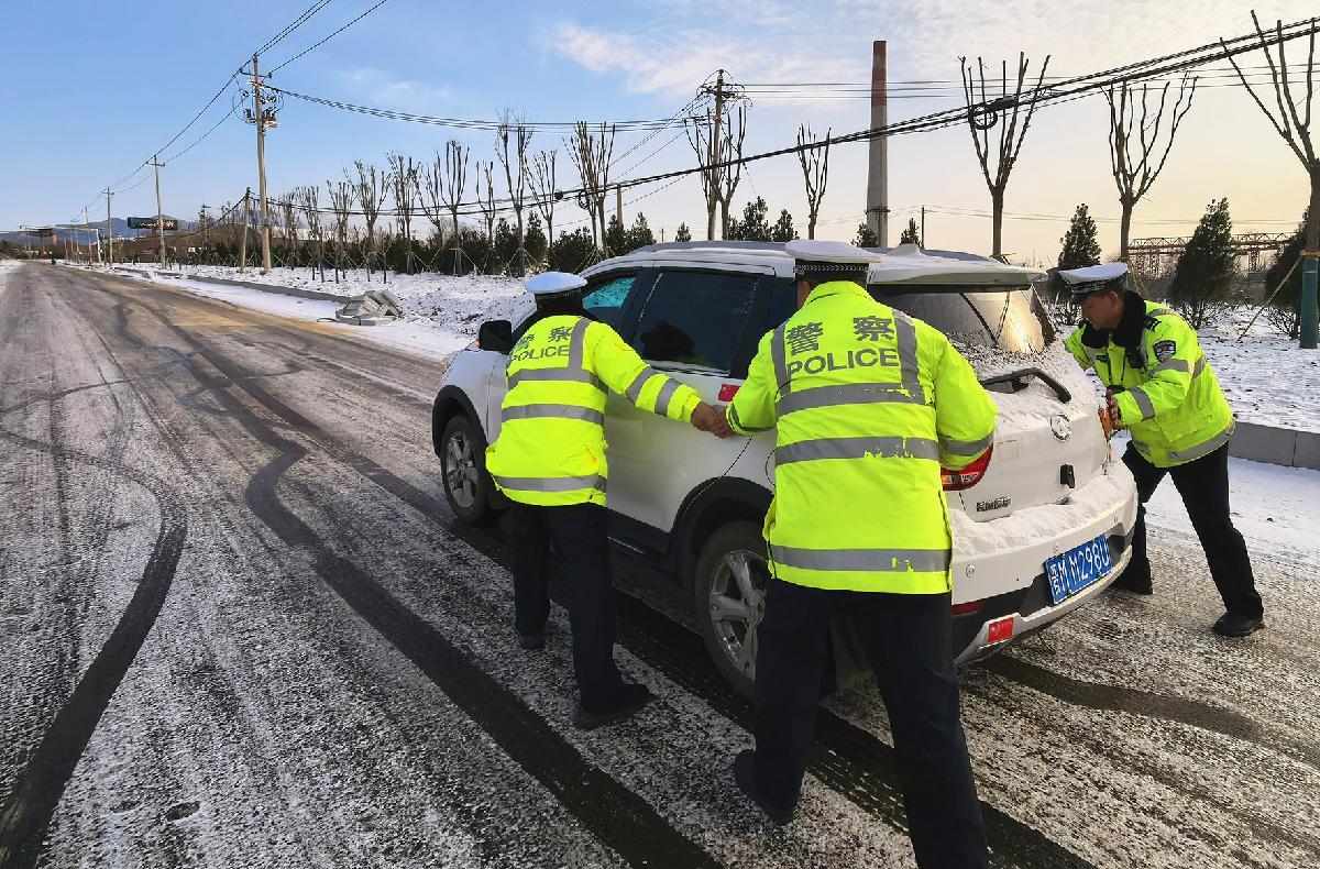1月20日,安徽省馬鞍山市含山縣公安局民警在冰雪路面疏導(dǎo)交通,保障群眾安全出行。
