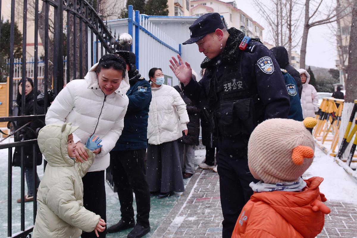 1月19日,山東省煙臺(tái)市公安局芝罘分局民警冒雪在轄區(qū)幼兒園門口執(zhí)勤,護(hù)送孩子們平安放學(xué)。