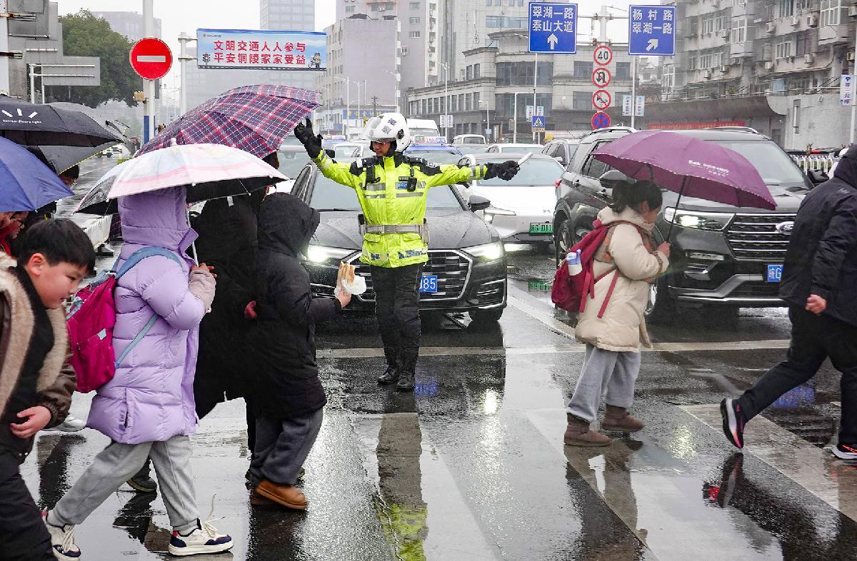 1月19日,安徽省銅陵市雨雪低溫天氣來襲。銅陵市公安局交管支隊(duì)立即啟動(dòng)應(yīng)急預(yù)案,增派中小學(xué)?!白o(hù)學(xué)崗”警力,全力守護(hù)學(xué)生出行安全。