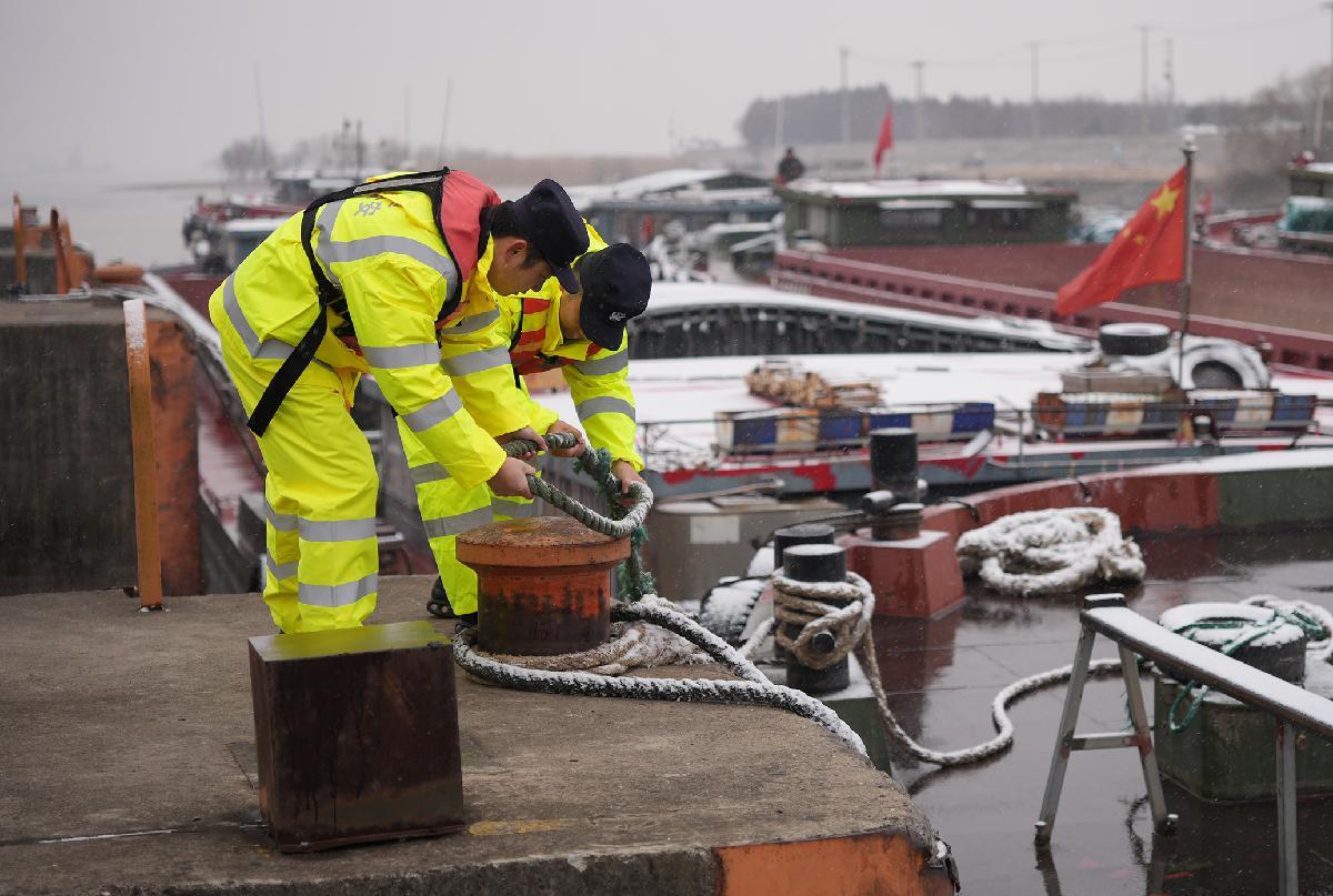 1月20日,長(zhǎng)江航運(yùn)公安局南通分局海門派出所民警對(duì)南通海門滸通河河閘、新江海河河閘外側(cè)長(zhǎng)江段水域待過閘船舶開展雨雪天氣專項(xiàng)安全檢查。