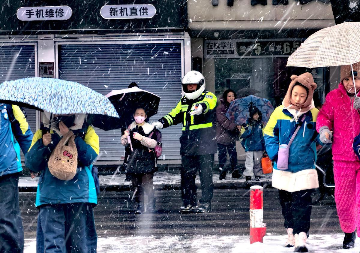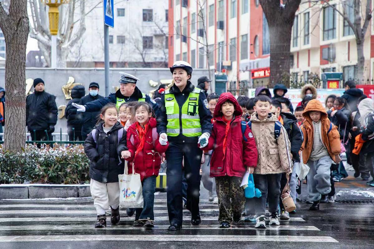 1月19日,山東省滕州市公安局交通管理大隊(duì)以雪為令,依托“護(hù)學(xué)崗”,為雪天出行的廣大師生保駕護(hù)航。