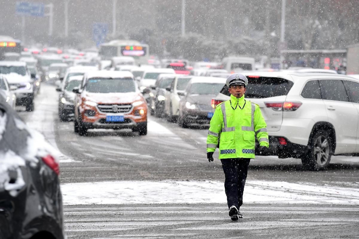 1月20日,安徽省蕪湖市主城區(qū)迎來暴風(fēng)雪天氣。蕪湖市公安局交管支隊(duì)弋江大隊(duì)全警上崗,疏導(dǎo)交通,確保轄區(qū)道路暢通有序。