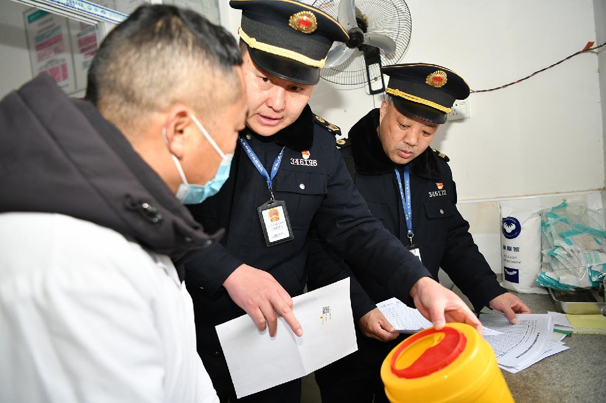 圖為1月26日,執(zhí)法人員在張寨鎮(zhèn)楊圩村衛(wèi)生室進(jìn)行監(jiān)督檢查。