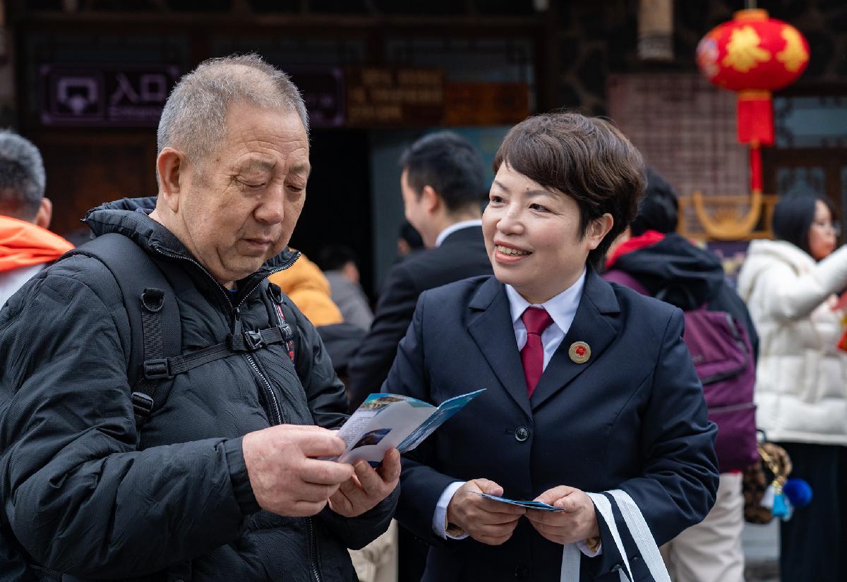 2月9日,貴州省黔東南苗族侗族自治州雷山縣司法局創(chuàng)新普法形式,將法律知識包裝成特色“年貨”,組織法治宣傳教育志愿者在景區(qū)開展豐富多彩的新春法治宣傳。