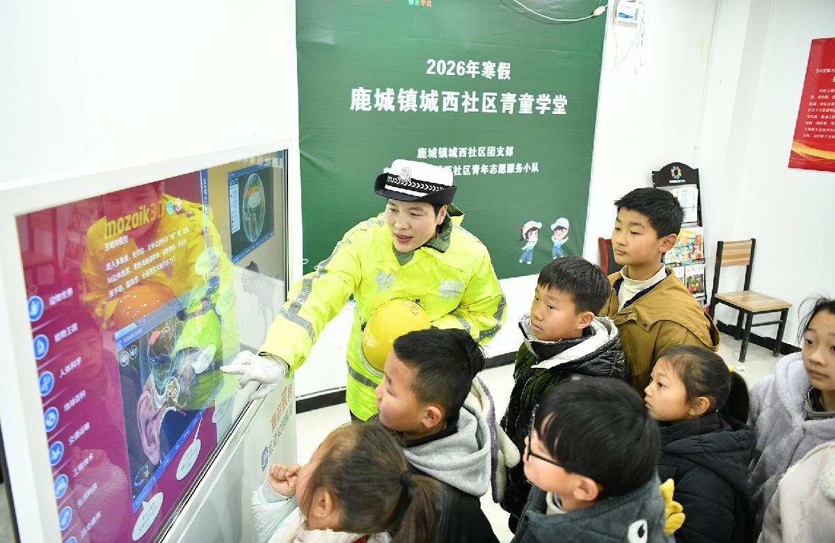 2月10日,安徽省阜南縣公安局交管大隊民警在鹿城鎮(zhèn)城西社區(qū)青童學(xué)堂里向孩子們講解假期出行安全知識。