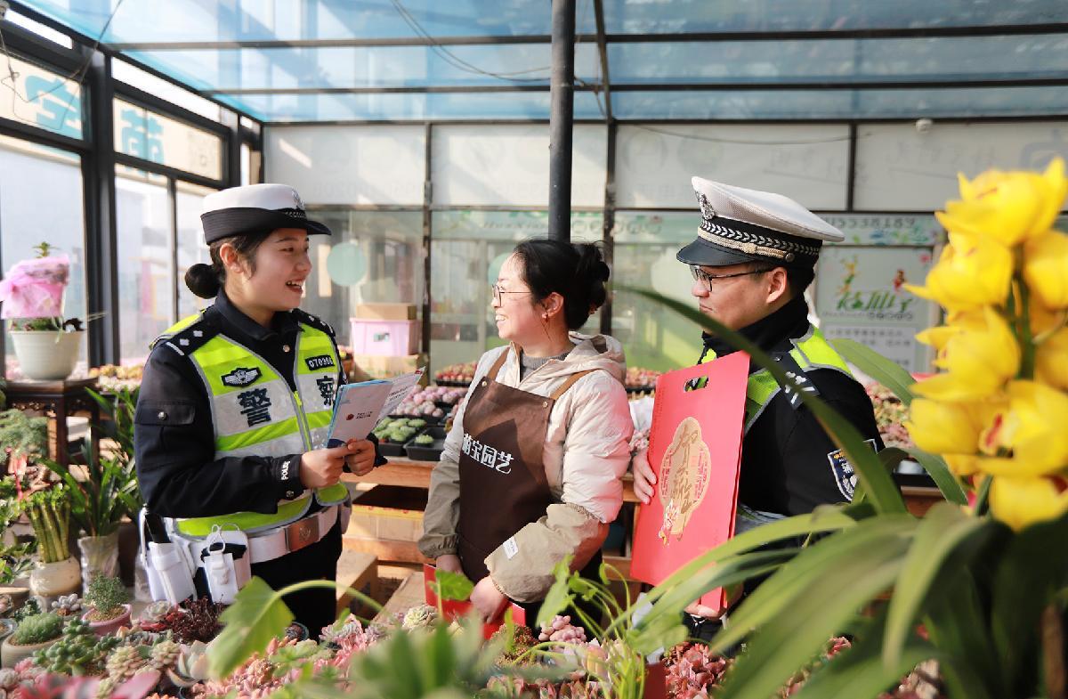 2月11日,安徽省蕪湖市公安局交管支隊弋江大隊組織民輔警來到花卉、年貨市場,開展“平安春運 交警同行”交通安全知識宣傳。