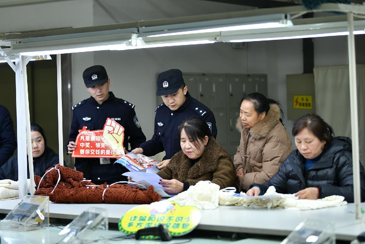 2月24日,安徽省阜南縣公安局經(jīng)濟(jì)開發(fā)區(qū)派出所民警在一家紡織企業(yè)車間為員工宣講防騙知識(shí)。