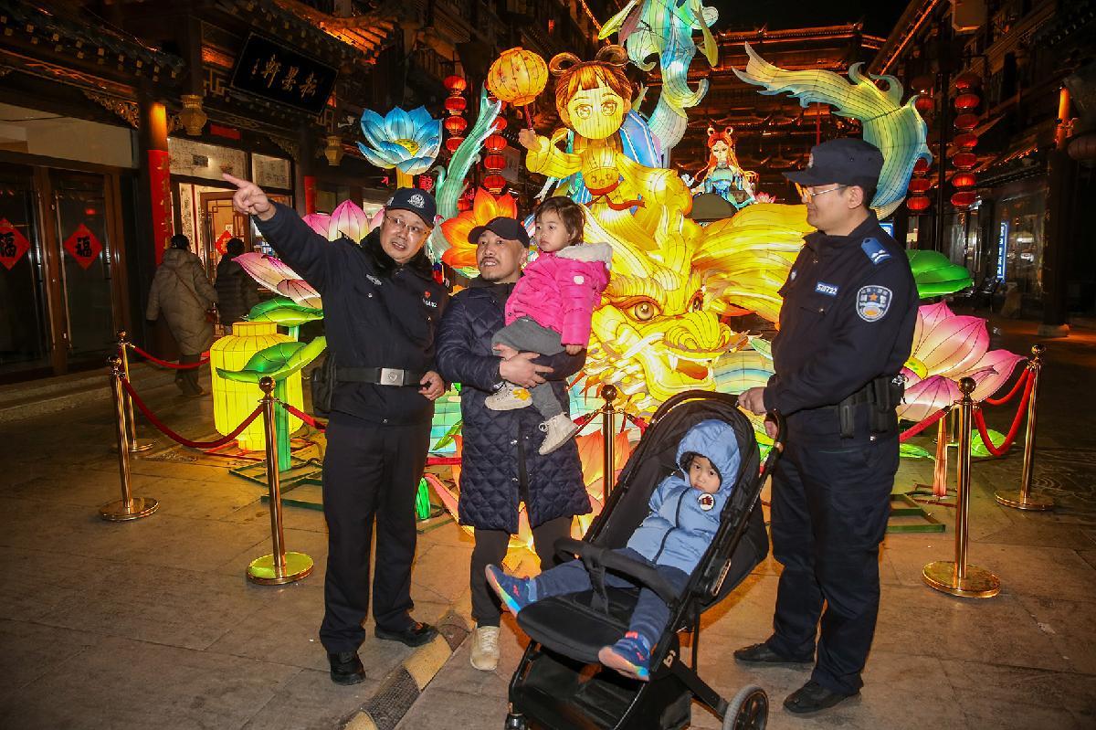 2月25日,山東省濟(jì)南市公安局市中分局大觀園派出所民警在大觀園迎春燈會(huì)現(xiàn)場(chǎng)執(zhí)勤巡邏,排查安全隱患,為游客提供服務(wù),確保市民度過一個(gè)平安喜樂的元宵佳節(jié)。