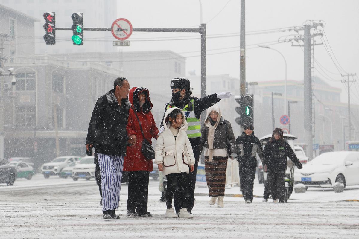 3月3日,遼寧省阜新市公安局交管支隊海州大隊女騎中隊民輔警冒雪執(zhí)勤。