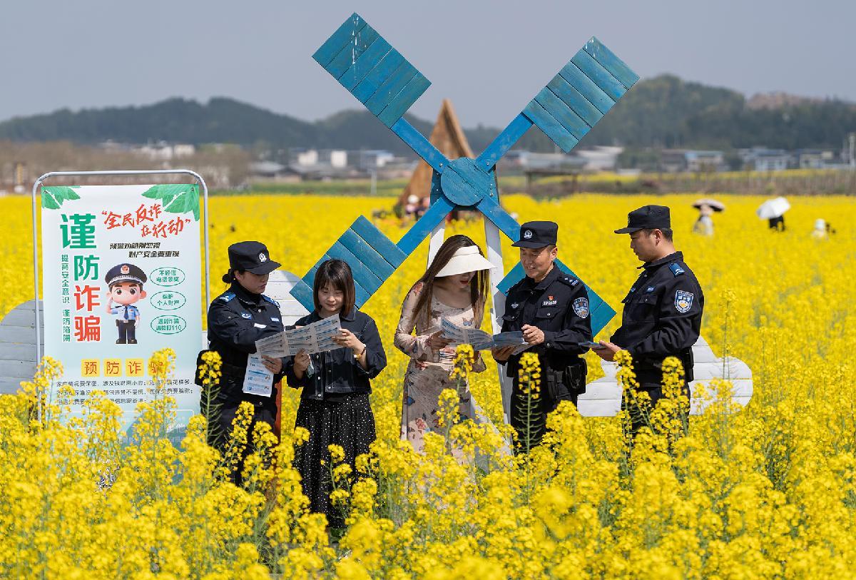 連日來,位于四川省綿陽市涪城區(qū)楊家鎮(zhèn)油菜花競相綻放,吸引大量群眾前來賞花。綿陽市公安局涪城分局楊家派出所組織民輔警加強現場巡邏,并開展反詐防騙等宣傳。