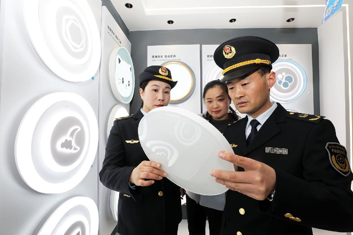 圖為3月11日,執(zhí)法人員對(duì)燈具等商品進(jìn)行檢查。