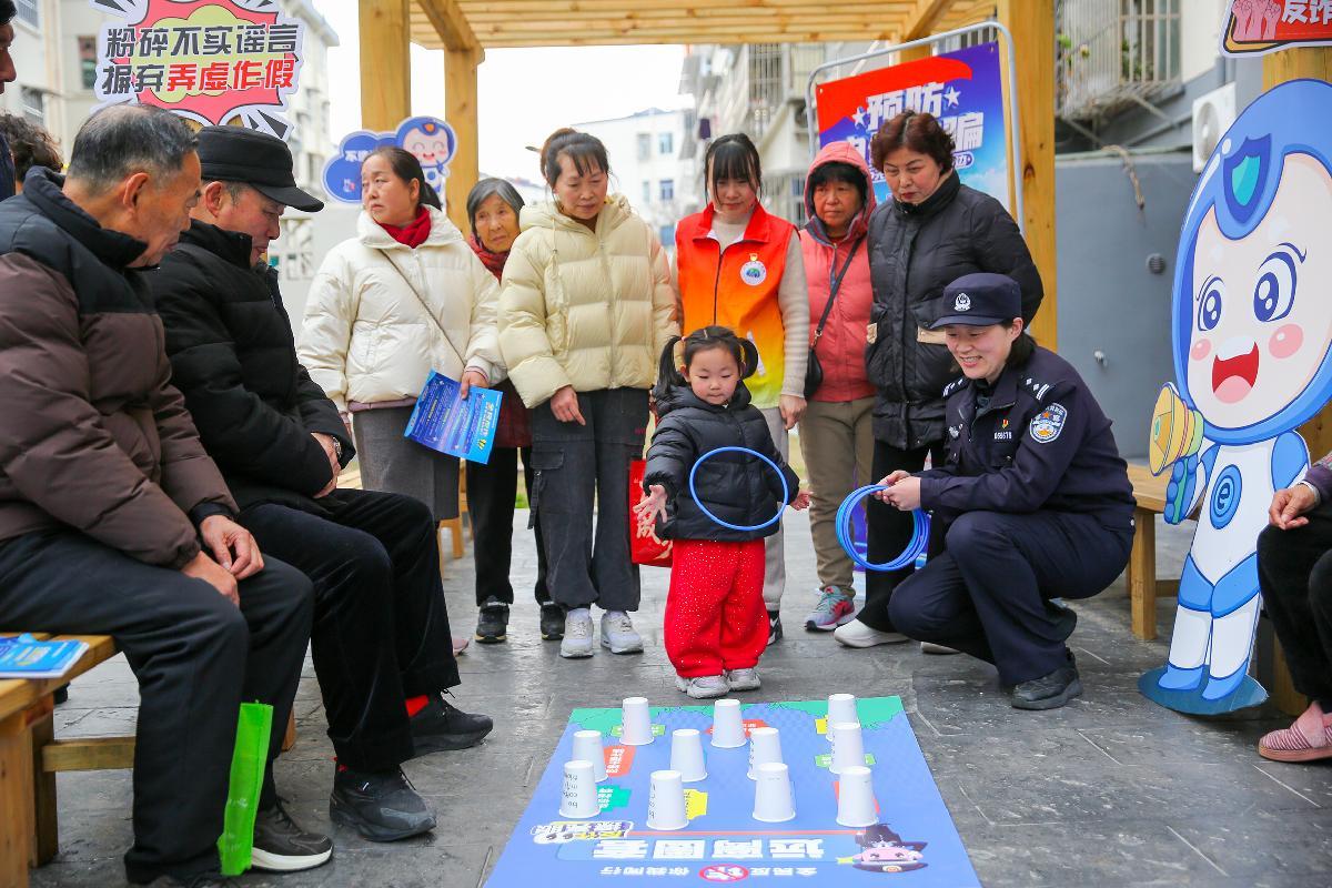 圖為民警通過(guò)趣味套圈游戲的方式,為居民宣講防騙技巧。