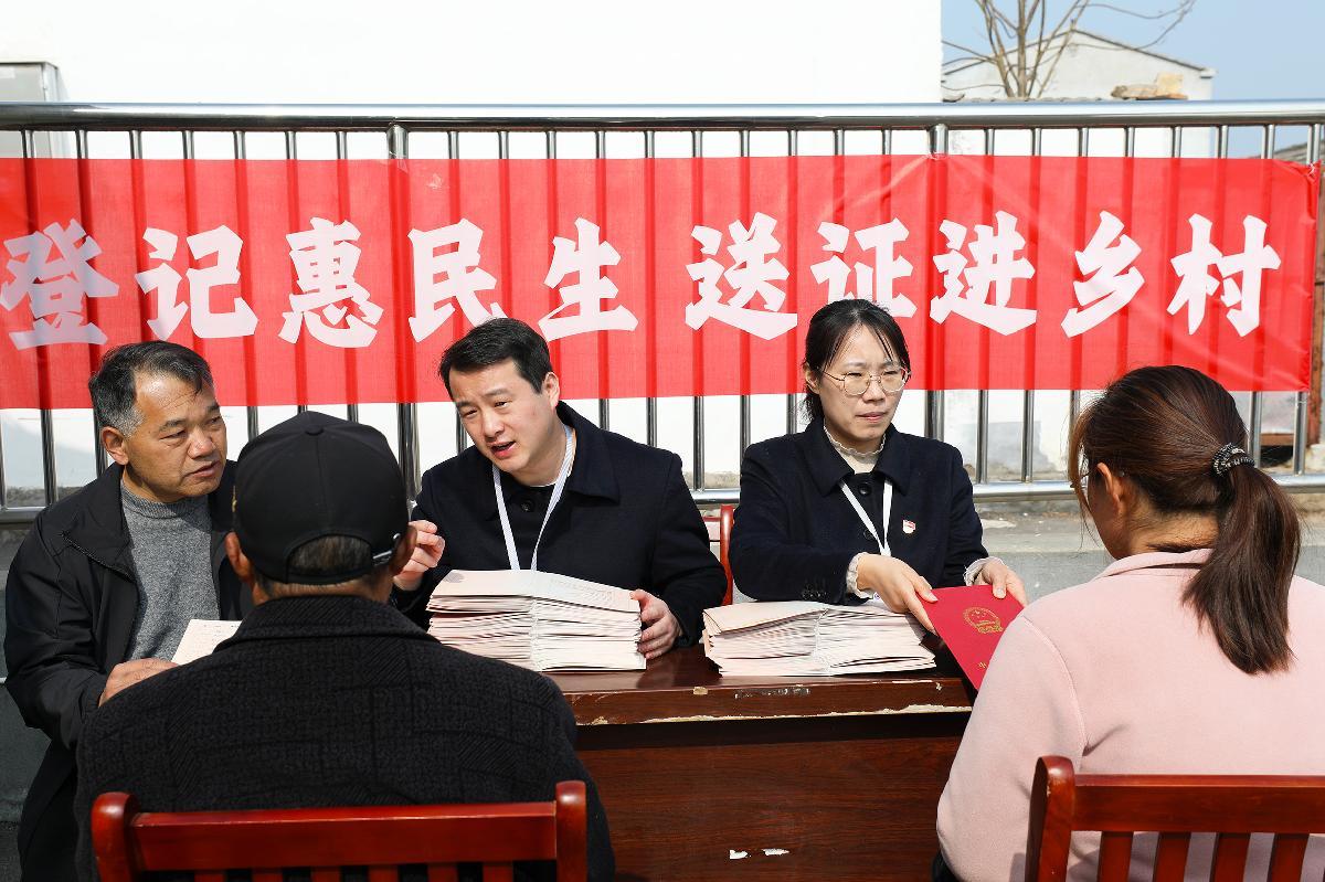 圖為3月23日,工作人員在烈山鎮(zhèn)南莊村將辦好的734本不動(dòng)產(chǎn)權(quán)證書(shū)送到村民手中。