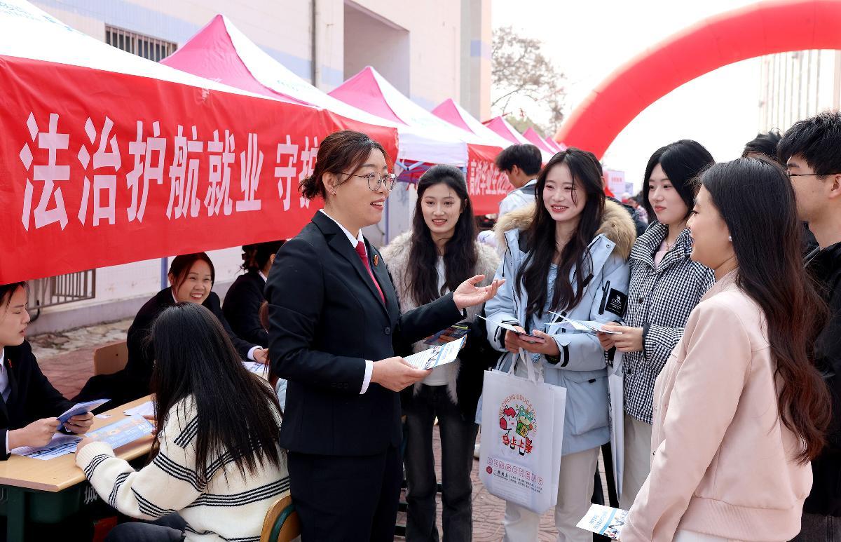 3月21日,山東省棗莊市市中區(qū)人民法院法官在棗莊學(xué)院2026年春季雙選會招聘活動現(xiàn)場,向求職大學(xué)生們宣傳勞動用工相關(guān)法律法規(guī)。