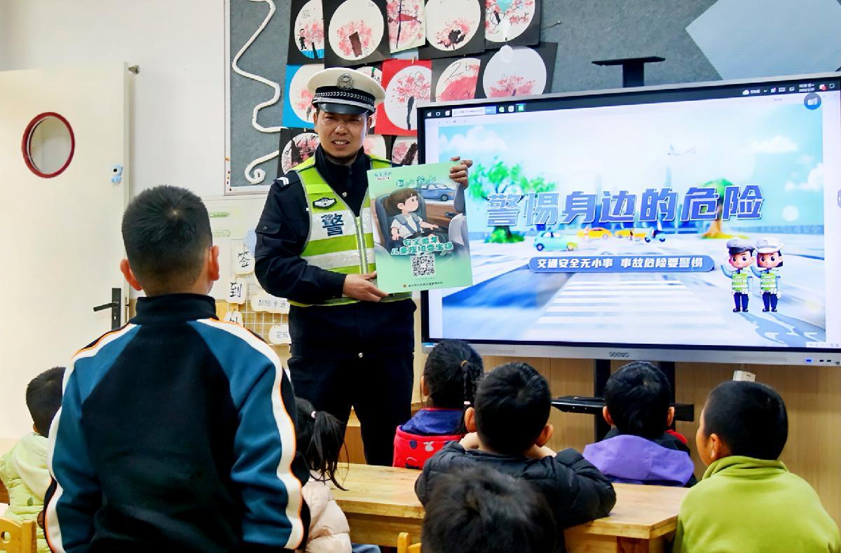 3月30日,安徽省亳州市公安局民警走進(jìn)開放大學(xué)附屬幼兒園,通過(guò)警示視頻、手勢(shì)操、兒歌等趣味互動(dòng),向萌娃們講解交通安全知識(shí)。