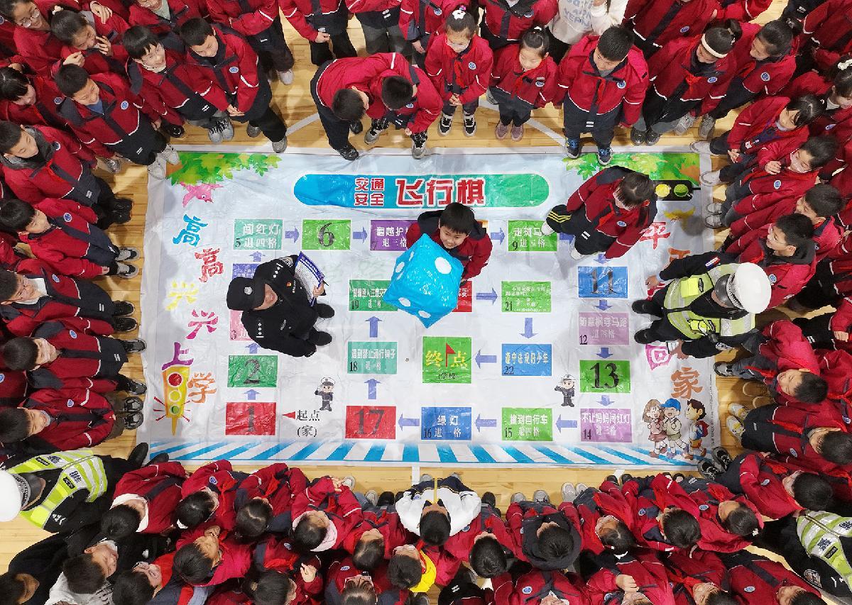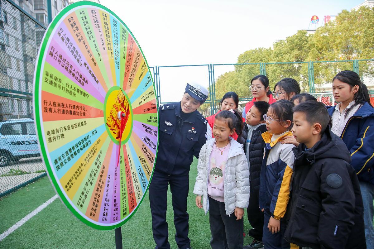 3月28日,江蘇省如皋市公安局民警在城南街道建設(shè)社區(qū),通過(guò)趣味游戲?yàn)楹⒆觽兤占敖煌ò踩R(shí)。
